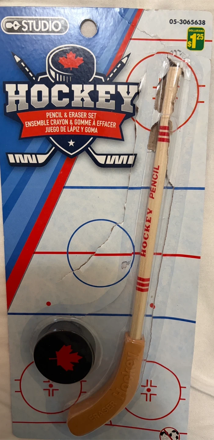 202Hockey pencil and eraser set from CC Studio! This set includes a hockey stick pencil and a puck eraser, perfect for any hockey fan. Originally bought for $1.25 at Dollarama