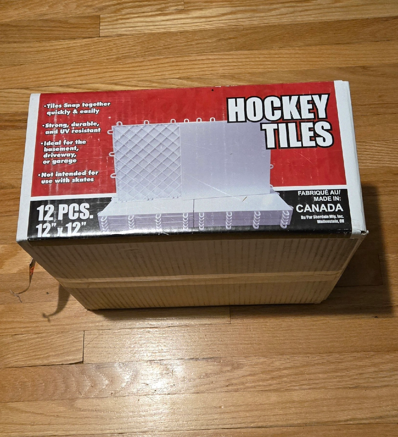 66Hockey Tiles, 12 pieces, each 12" x 12". Vendor # FI-6870-12 Canadian Tire # 083-9034-8 - Tiles snap together quickly and easily - Strong, durable, and UV resistant - Ideal for the basement, driveway, or garage - Not intended for use with skates Made in Canada