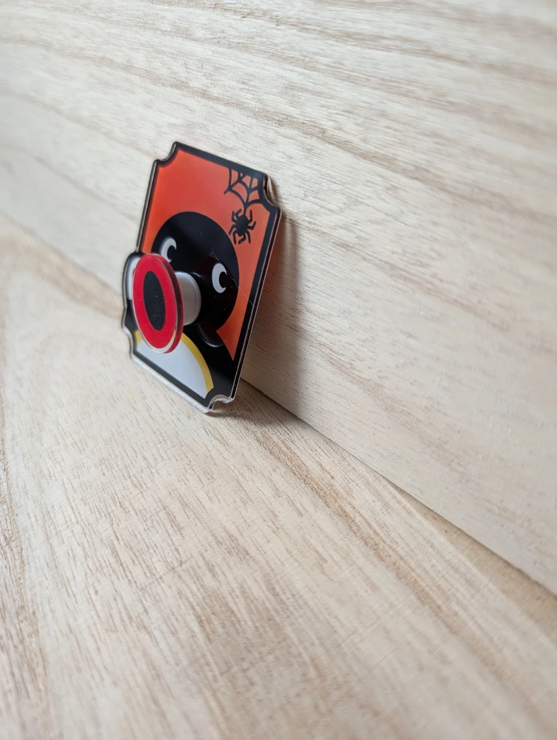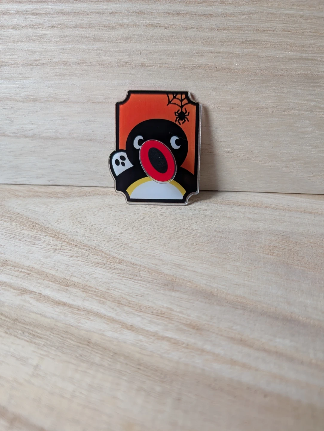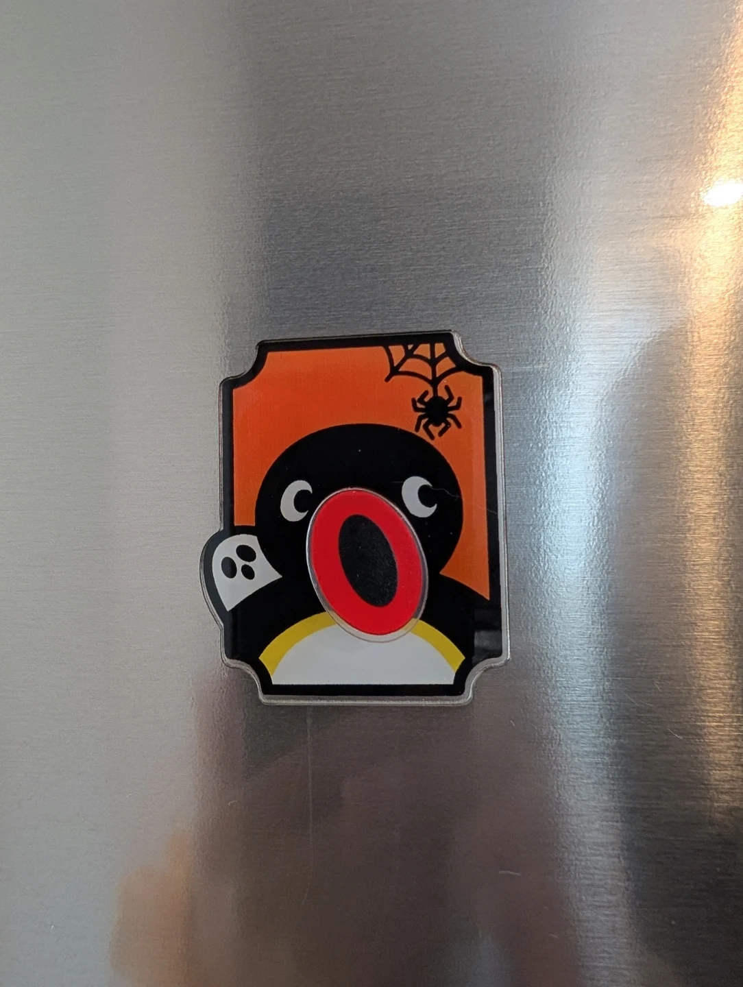 Cute Pingu magnet with a Halloween theme, featuring a spider and web. It's made of clear acrylic and perfect for adding some spooky fun to your fridge! Great for fans of the classic Pingu character.