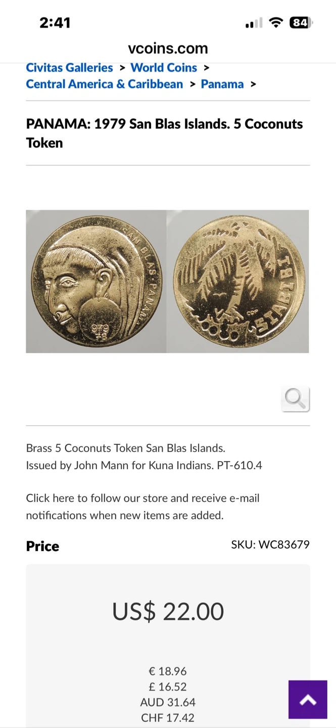 Buy & SellPanama 1979 San Blas Islands 5 Coconuts TokenPanama 1979 San Blas Islands 5 Coconuts Token$10Brass 5 Coconuts Token from San Blas Islands, Panama. Issued in 1979 for the Kuna Indians. This token is a collectible item.ConditionLike newWHERE TO MEETCheck LocationView MapSELLERverifiedMustafaMarine Hamilton39038 reviews0 chats·1 favorites·2 viewsSEND CHAT TO SELLERHi Mustafa! I’m interested in your listing.Hi Mustafa! I’m interested in your listing.Get the Karrot app to chatSign In to chat