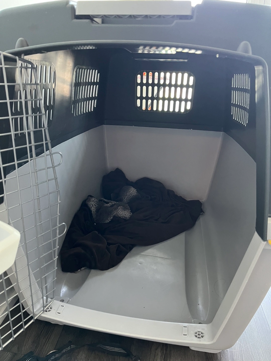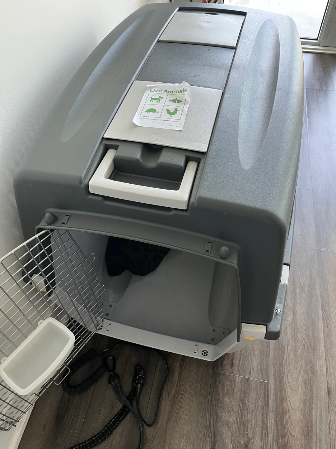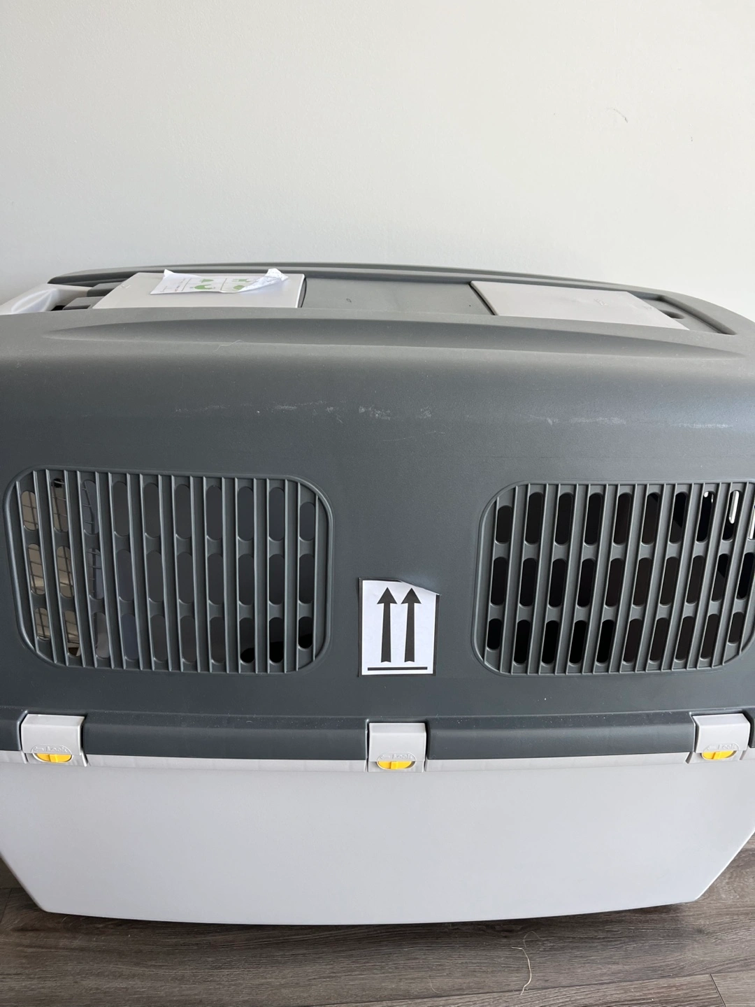 Pet carrier. Two-tone design. Features ventilation. Handle on the top. Great for keeping pets safe during travel or in unfamiliar environments.