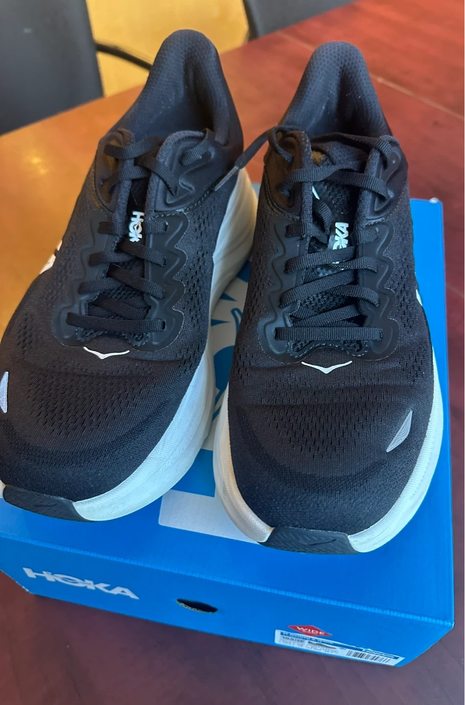 Selling a pair of Hoka Bondi 9 Wide (2E) running shoes in men's US size 10.5. They are black with a white sole. The box is included! I wore the shoes for a week, so they aren’t brand new but in good shape!