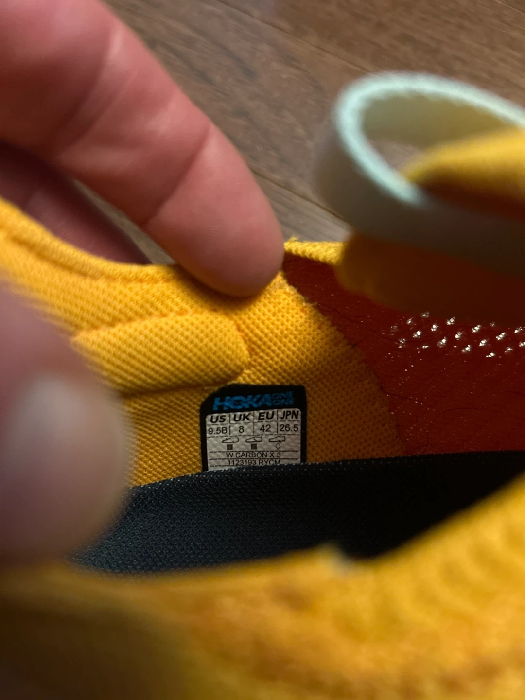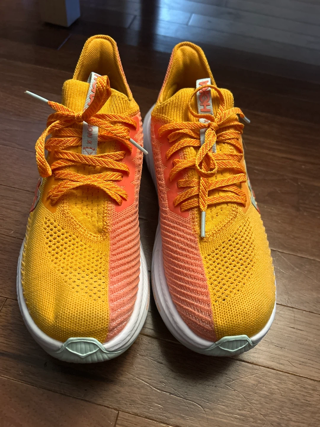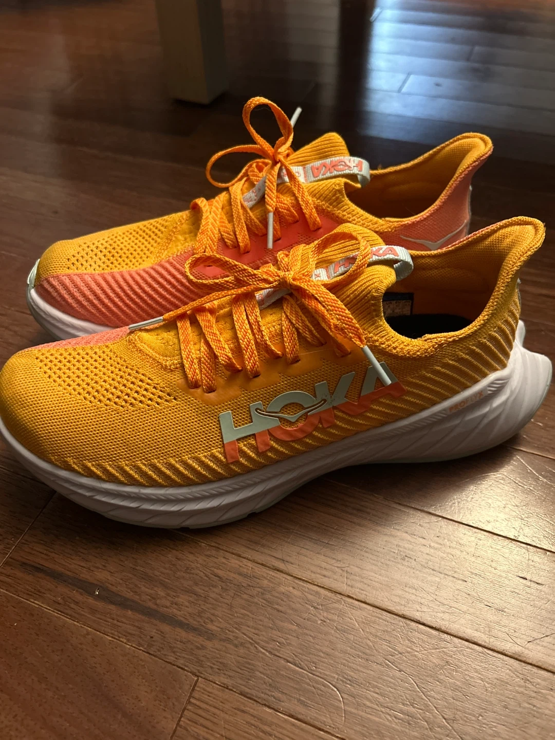 Selling a pair of Hoka Carbon X 3 women's running shoes. They are a vibrant yellow and orange colour. The size is US 9.5 / UK 8 / EU 42 / JPN 26.5. Great for running!