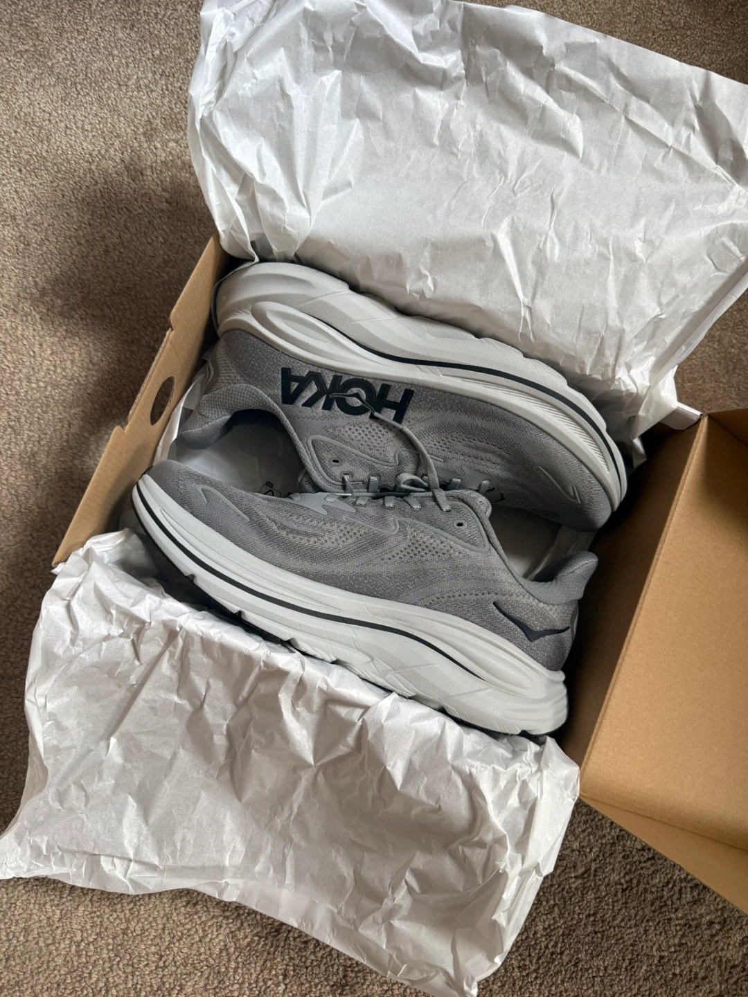 Selling a pair of Hoka Clifton 10 running shoes in grey. They are in great condition and come with the original box. These shoes are known for being lightweight and comfortable, perfect for running or everyday wear