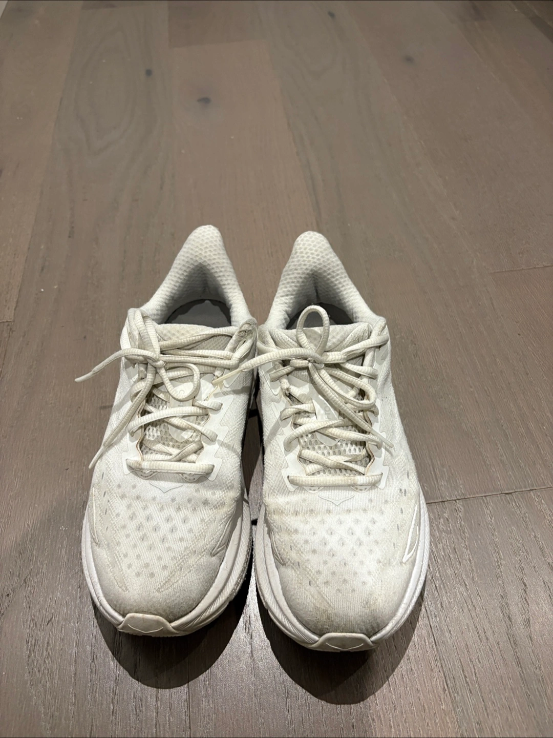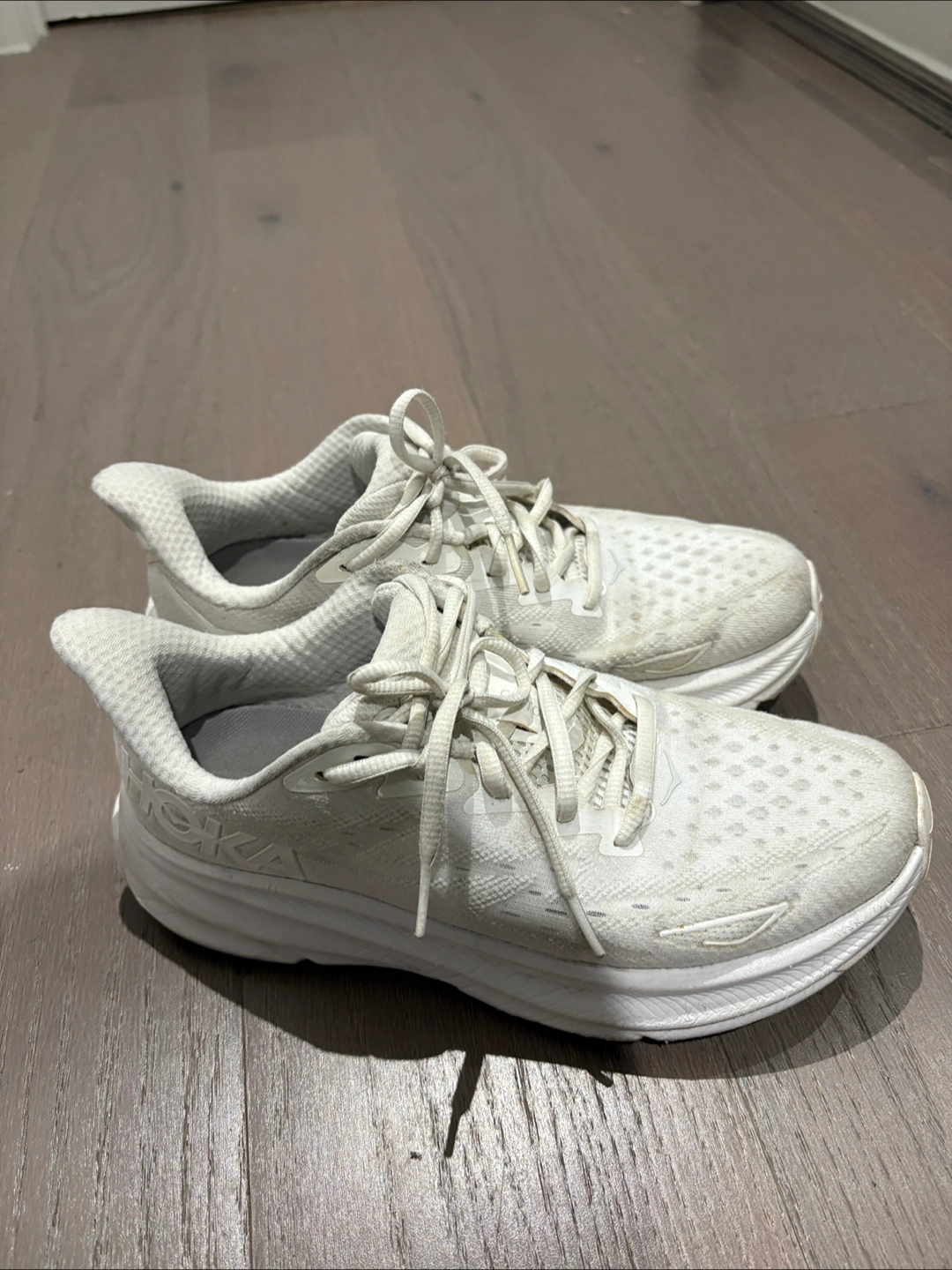 Selling a pair of Hoka Clifton 9 running shoes in white. They're in good condition and ready for your next run! These shoes are known for their lightweight design and comfortable cushioning, making them great for everyday training or longer distances