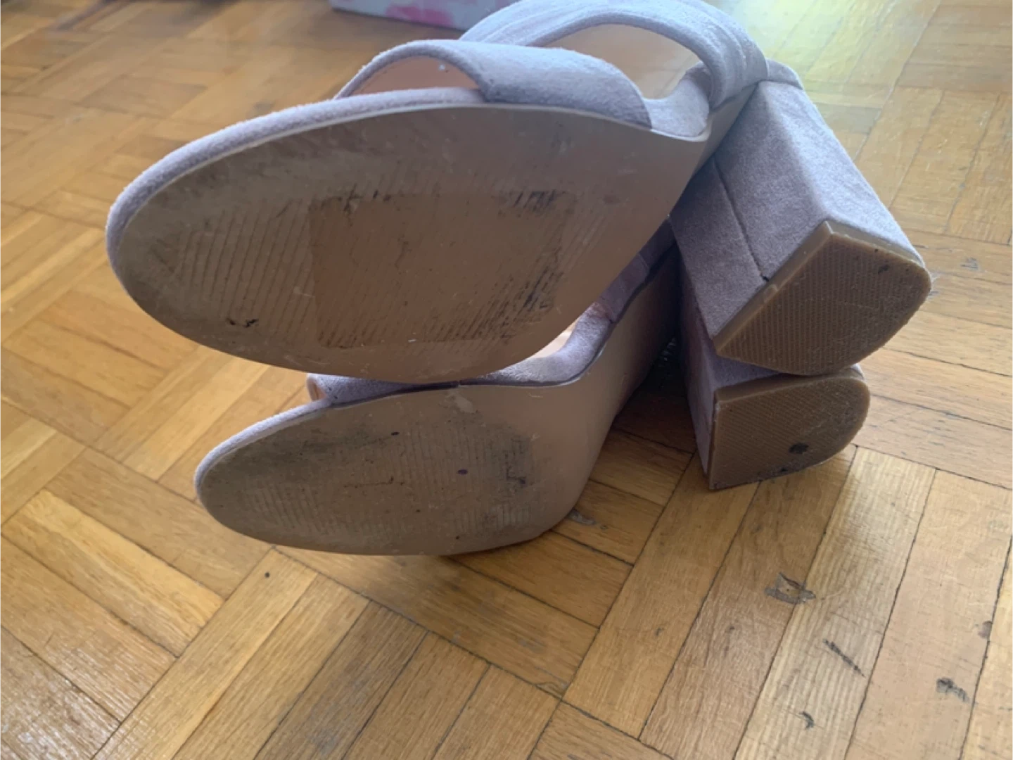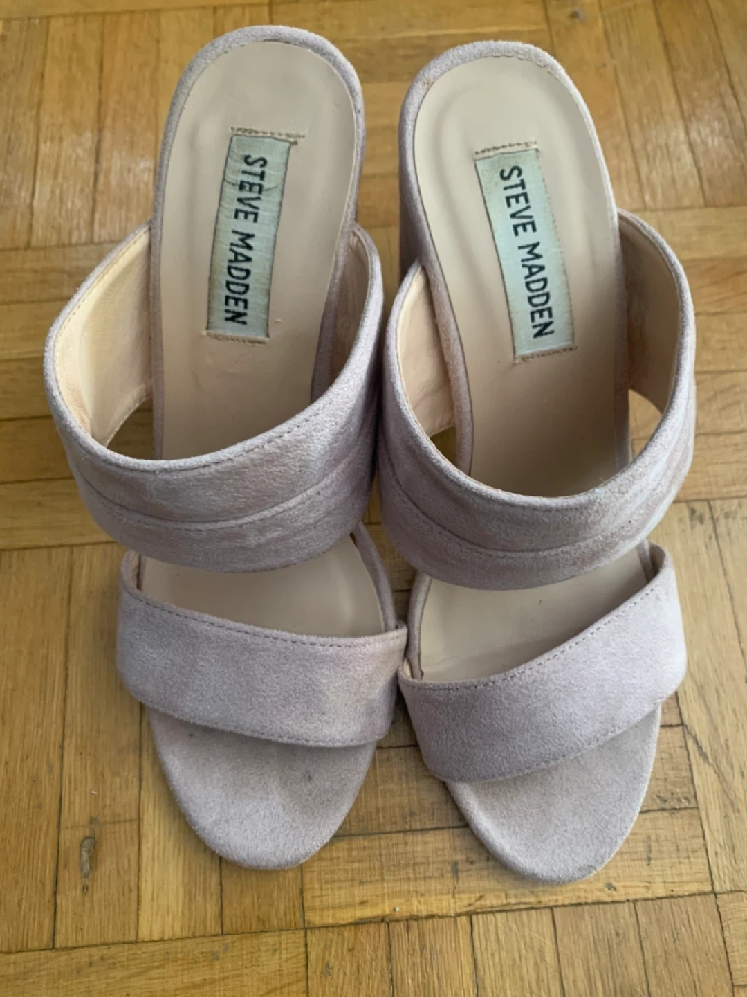 Light pink Steve Madden heeled sandals with a block heel. Suede-like material on the straps. Perfect for dressing up an outfit!