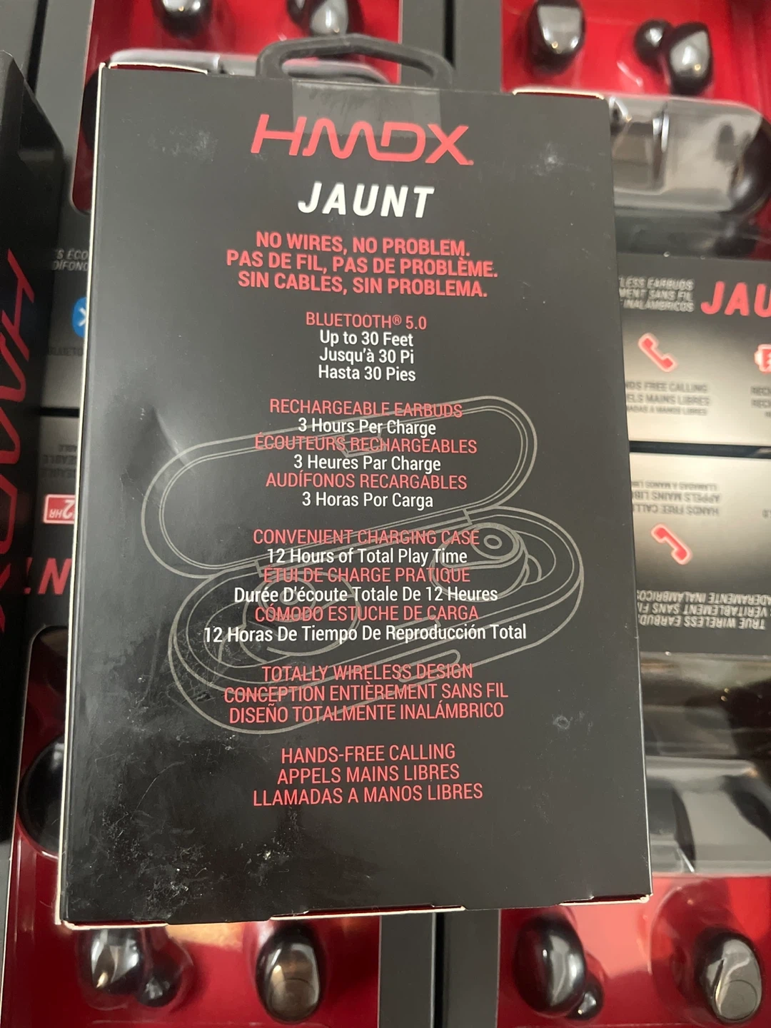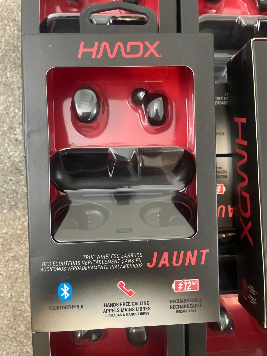 (13 pcs) These HMDX JAUNT true wireless earbuds feature Bluetooth 5.0 connectivity up to 30 feet. They offer rechargeable earbuds with 3 hours per charge and 12 hours of total play time with the convenient charging case. Enjoy hands-free calling with these earbuds.