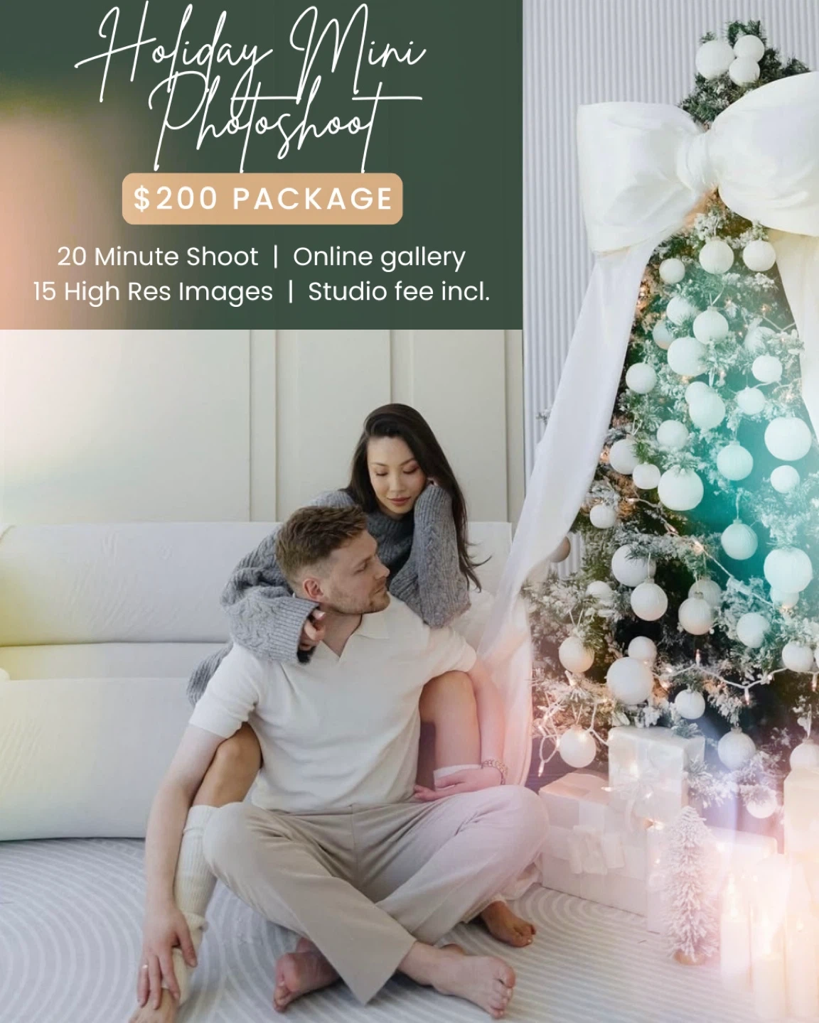 23Offering a holiday mini photoshoot package! It includes a 20-minute shoot, an online gallery, and 15 high-resolution images. The studio fee is included in the $200 package