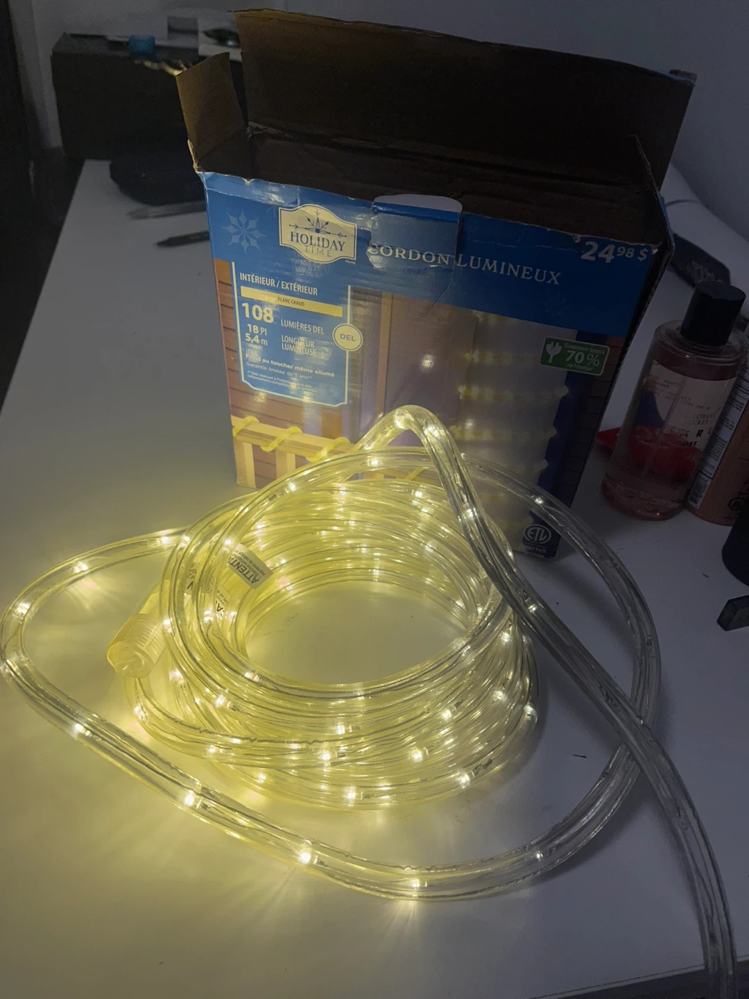 Selling a Holiday Time 108 LED rope light, perfect for adding a warm glow to your indoor or outdoor space. The box says it's 5.4 meters long. Get ready to light up your home!