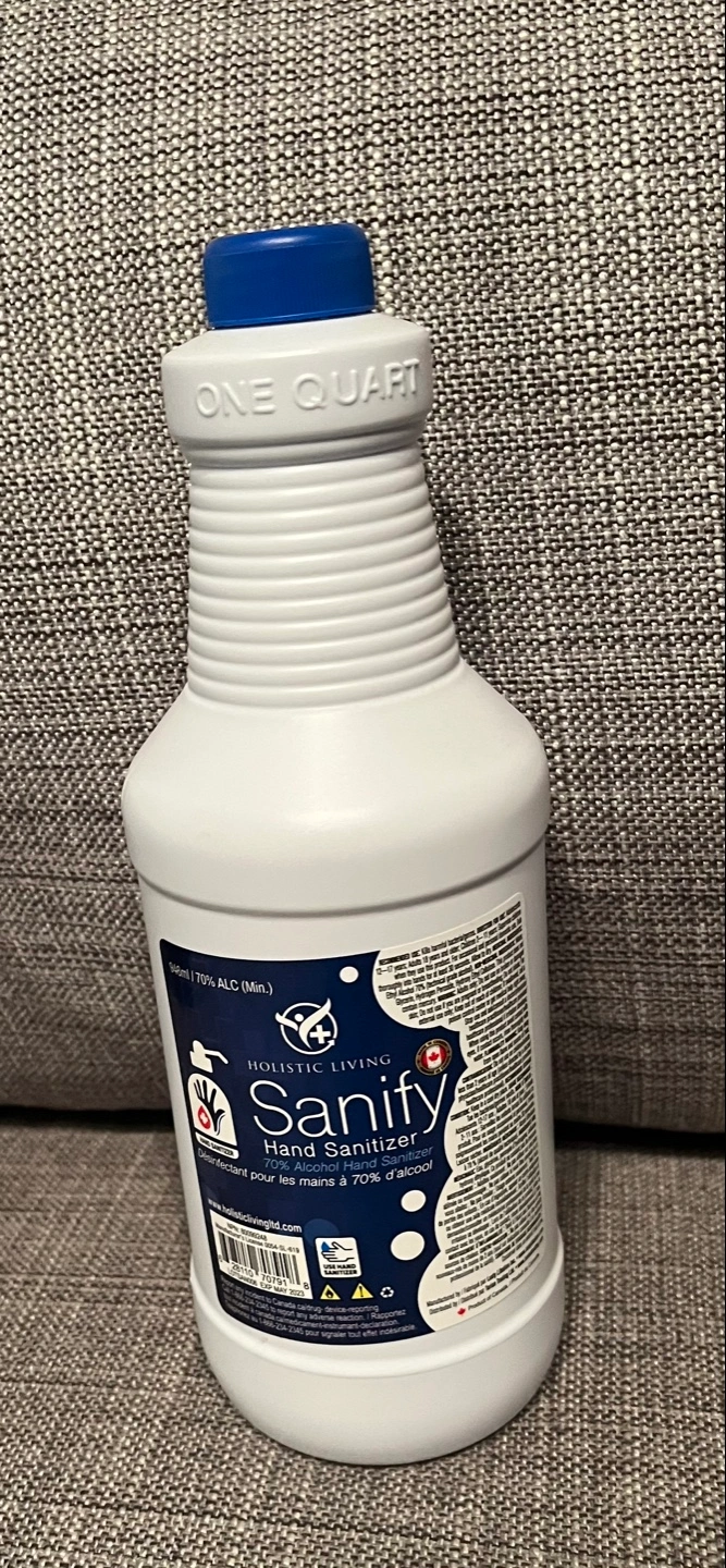 One quart bottle of Holistic Living Sanify hand sanitizer. 70% alcohol. Disinfectant for hands. 946ml 6 available 1 for $10 2 for $15