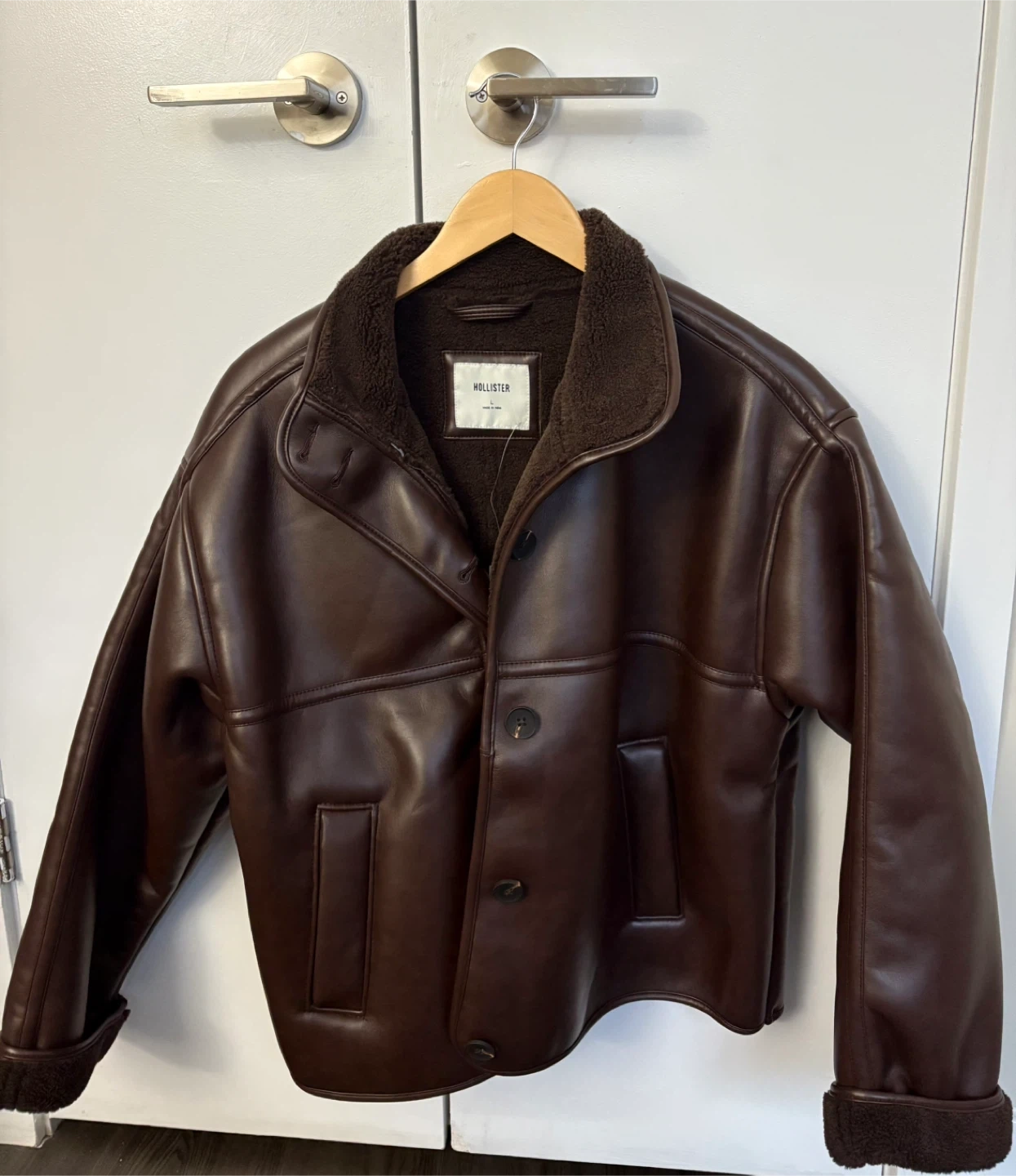 10Selling a Hollister faux leather jacket in a lovely brown colour! It's a size large and features a cozy, furry lining. Never been worn out, have only tried it on, tag is still on. Original price - $94.95 plus tax
