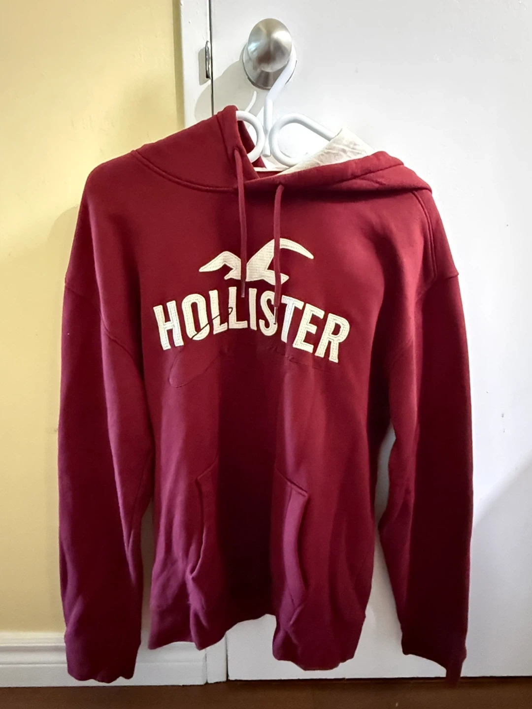 10Selling a comfy burgundy Hollister hoodie! It's in great condition and perfect for those cooler Canadian evenings. The classic Hollister logo is on the front, adding a touch of casual style to your wardrobe