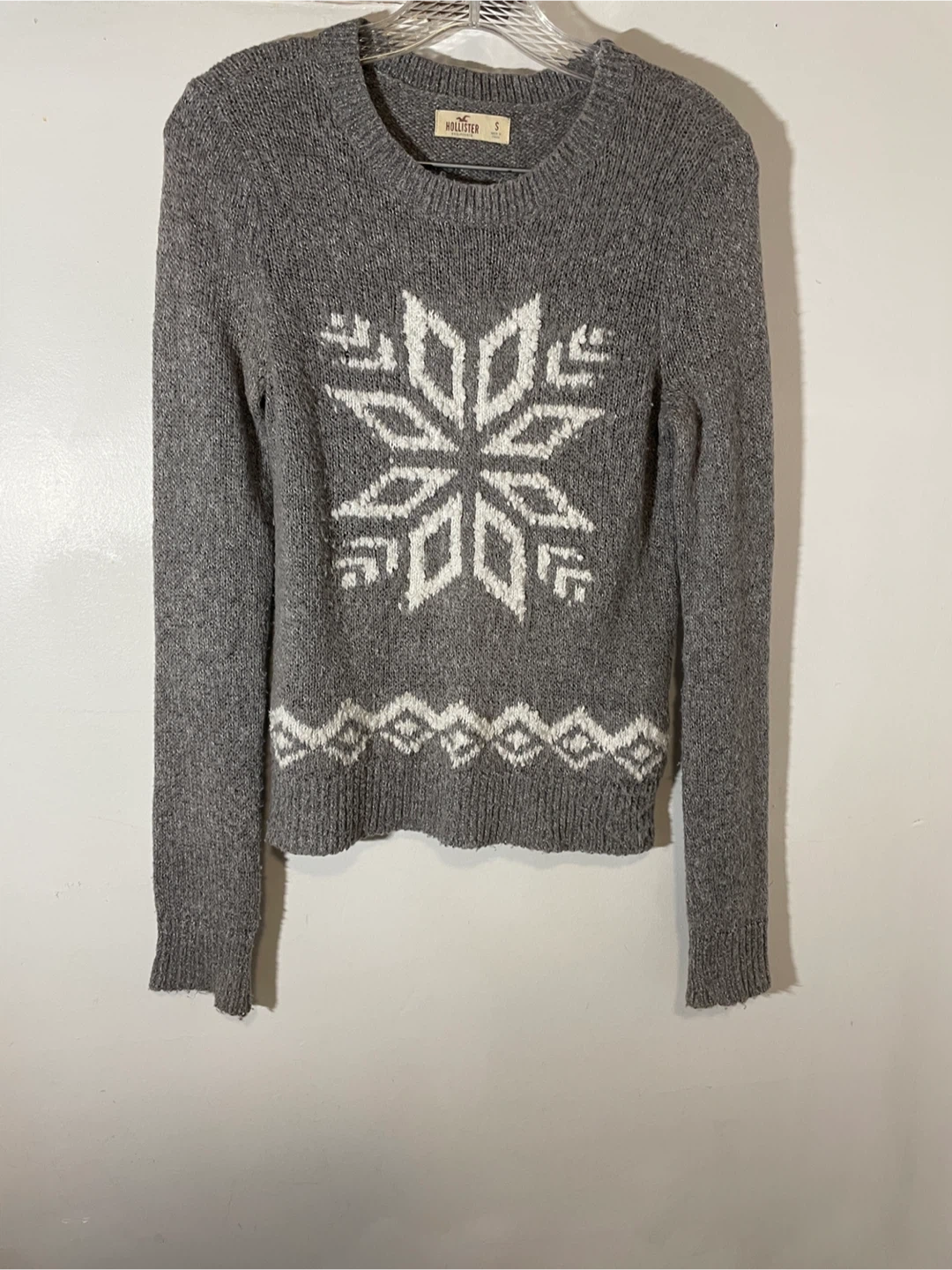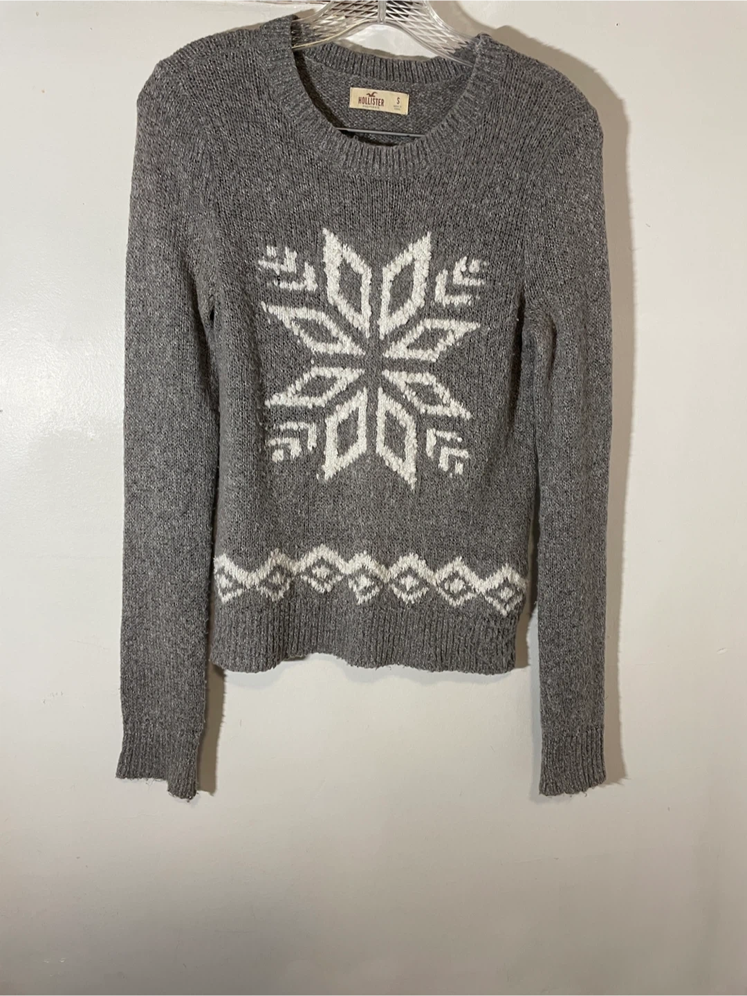 Cozy up in this cute Hollister sweater! It's a size small and features a lovely snowflake design. The grey colour makes it super versatile for any outfit. Perfect for those chilly Canadian days!
