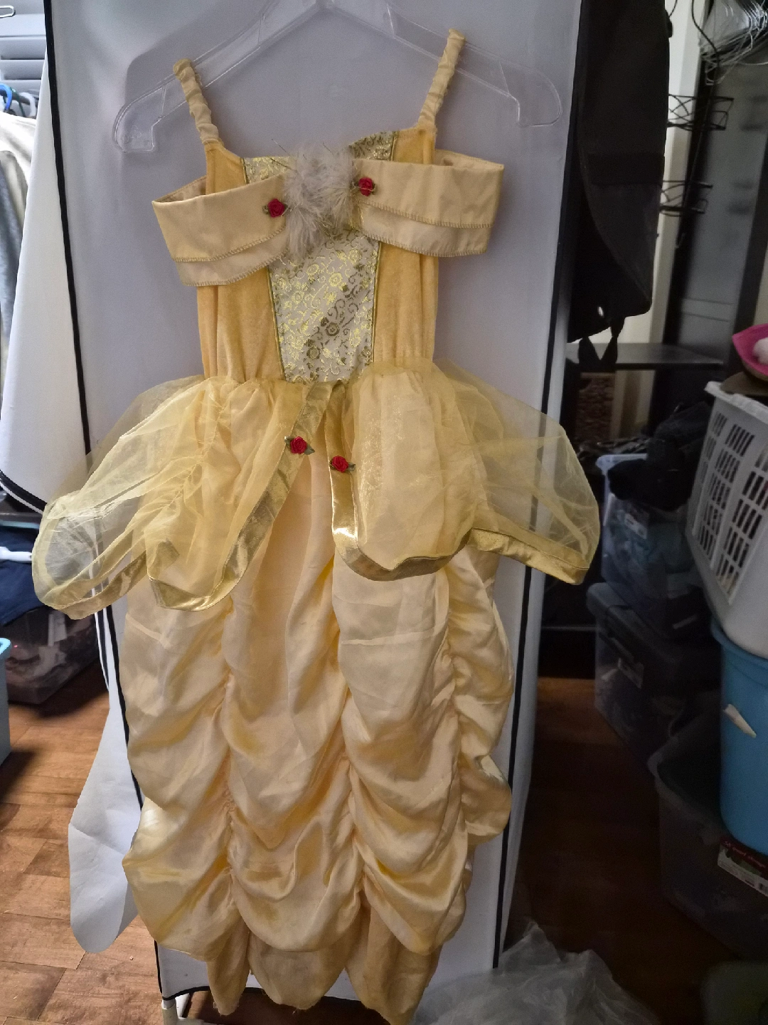 53A beautiful Belle-inspired princess dress, perfect for dress-up or costume parties! The dress is a lovely yellow colour with gold detailing and red rose accents. It features a layered skirt and decorative bodice. $15 each or all for $50
