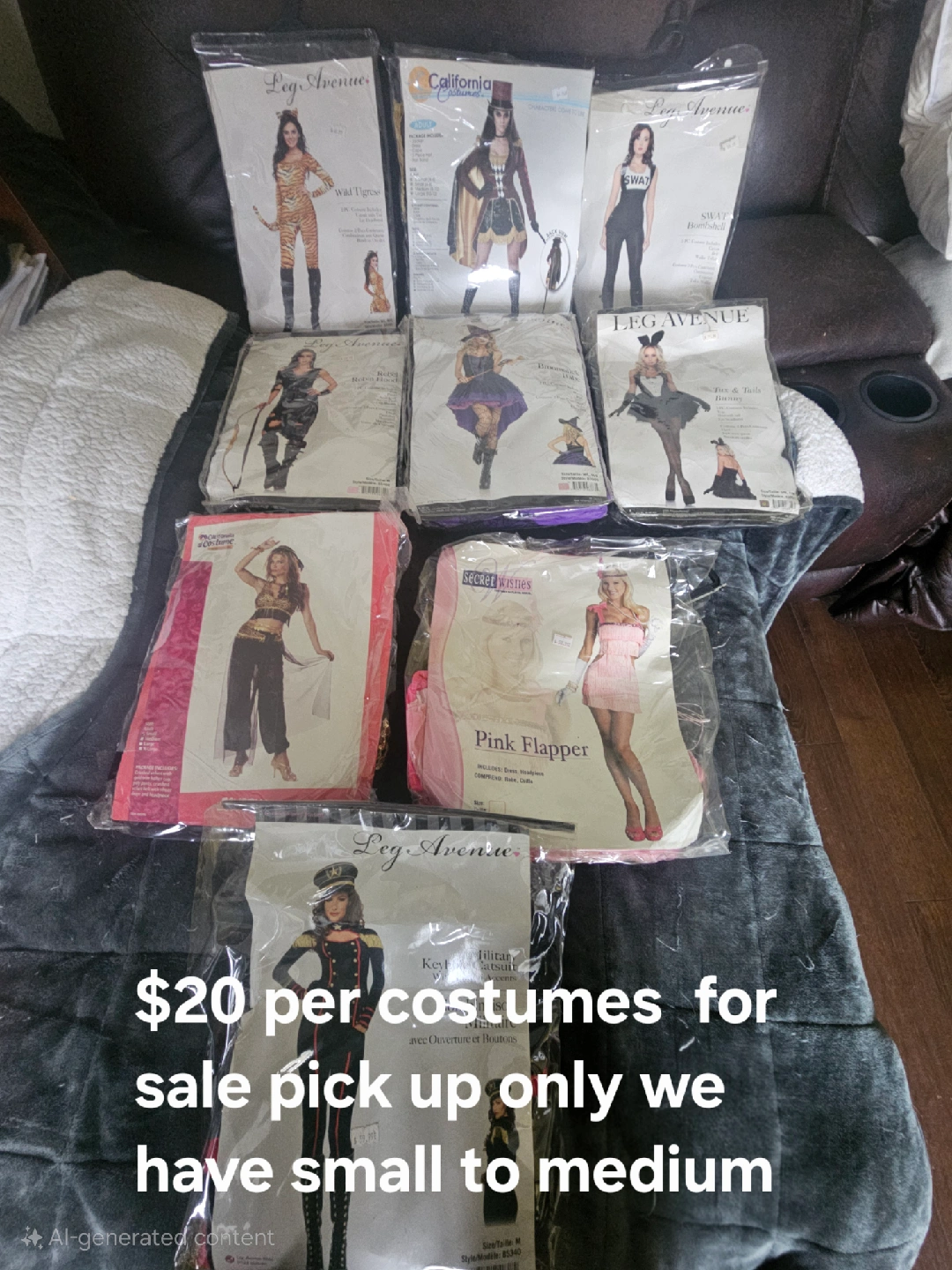 10I have a variety of costumes for sale! Brands include Leg Avenue and California Costumes. They are all size small to medium. $20 each