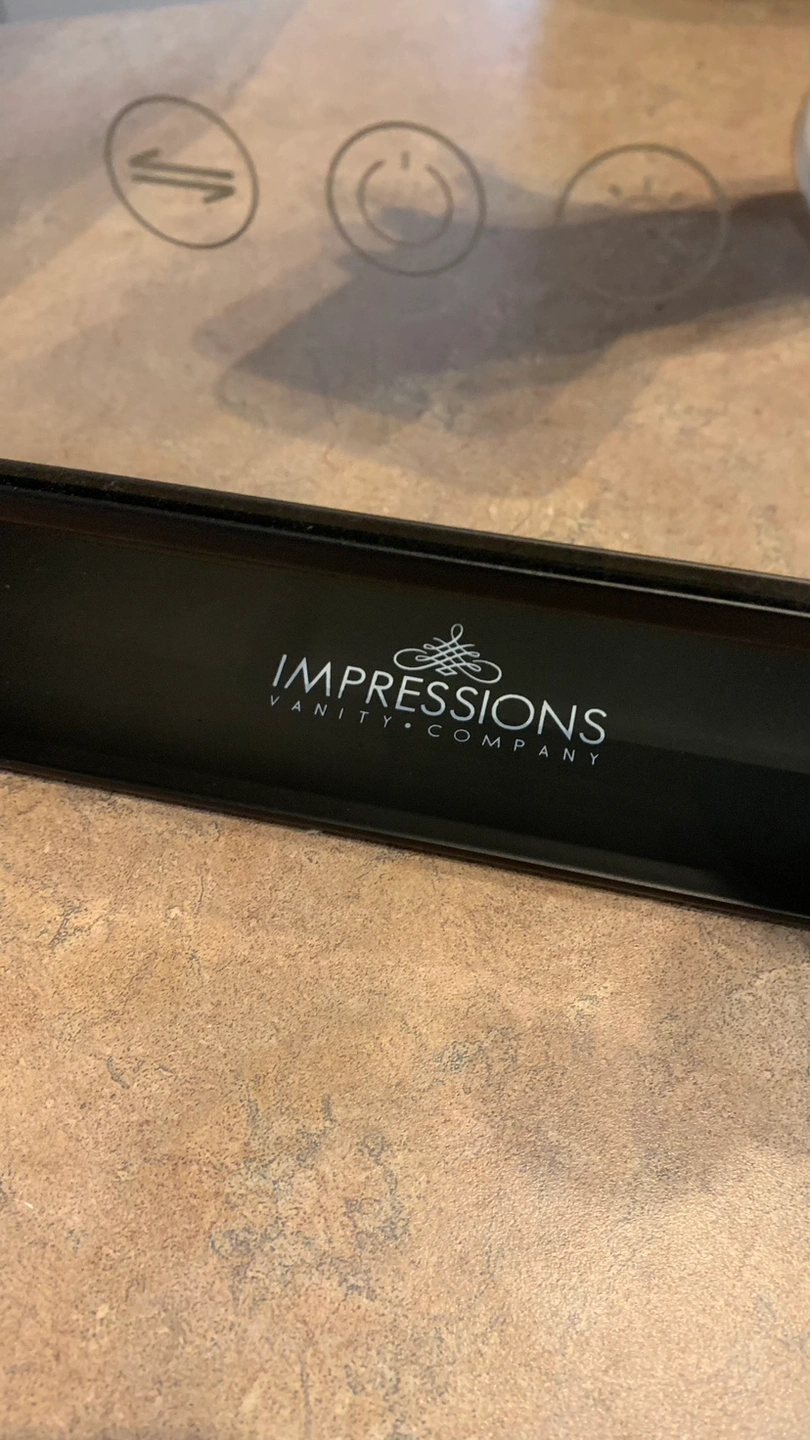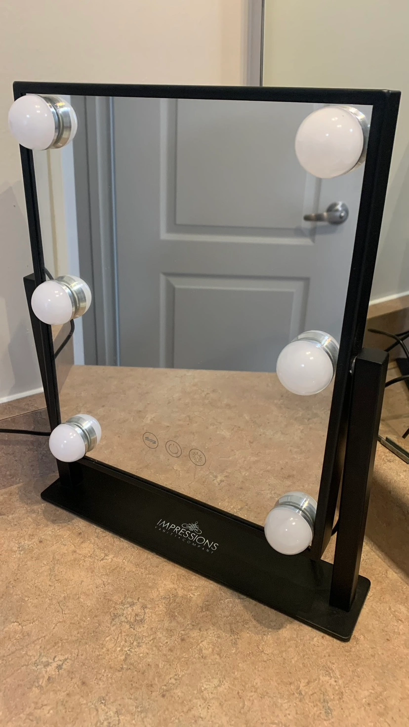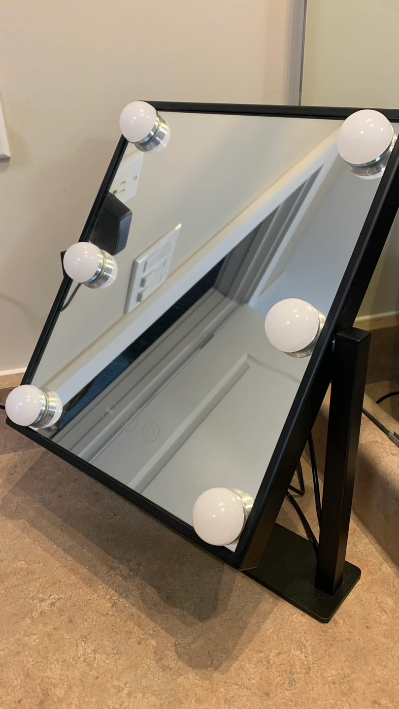 104A vanity mirror with built in lights, great for makeup application. It is black with a stand that tilts. It has a cord. It features three different light settings.