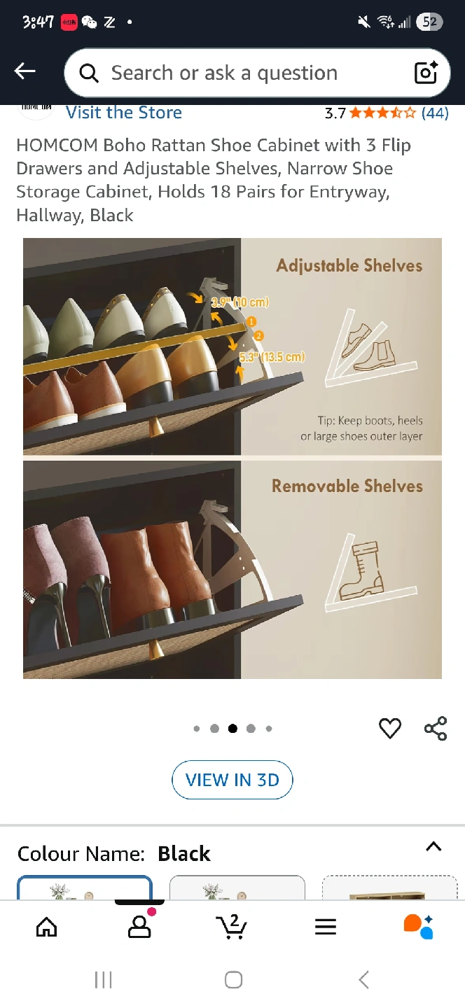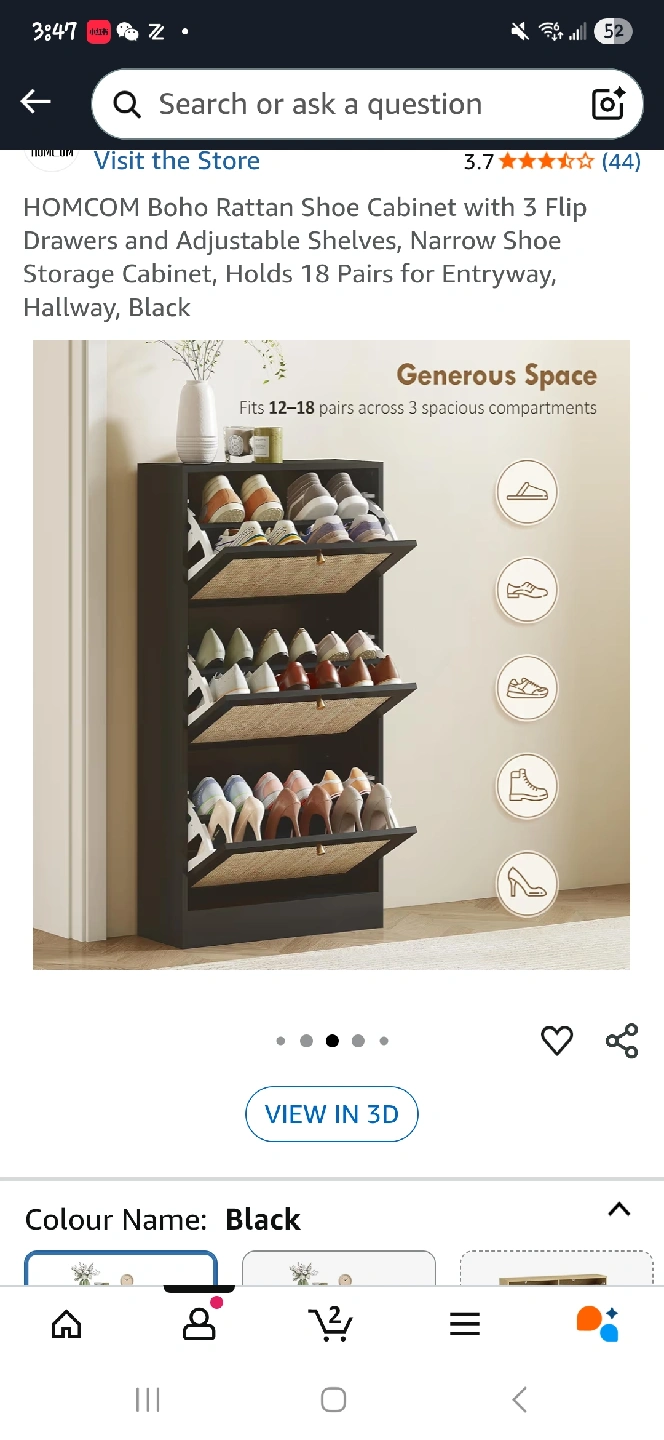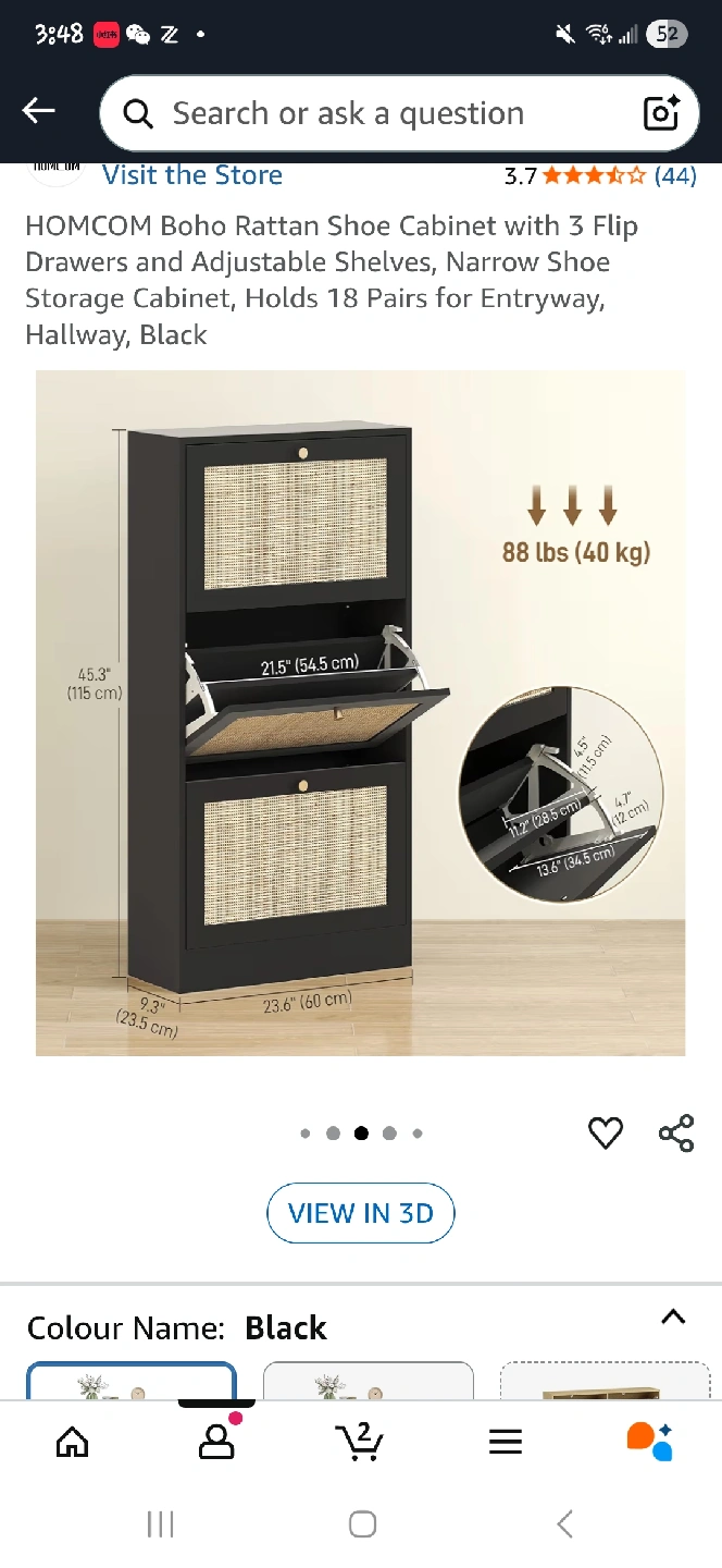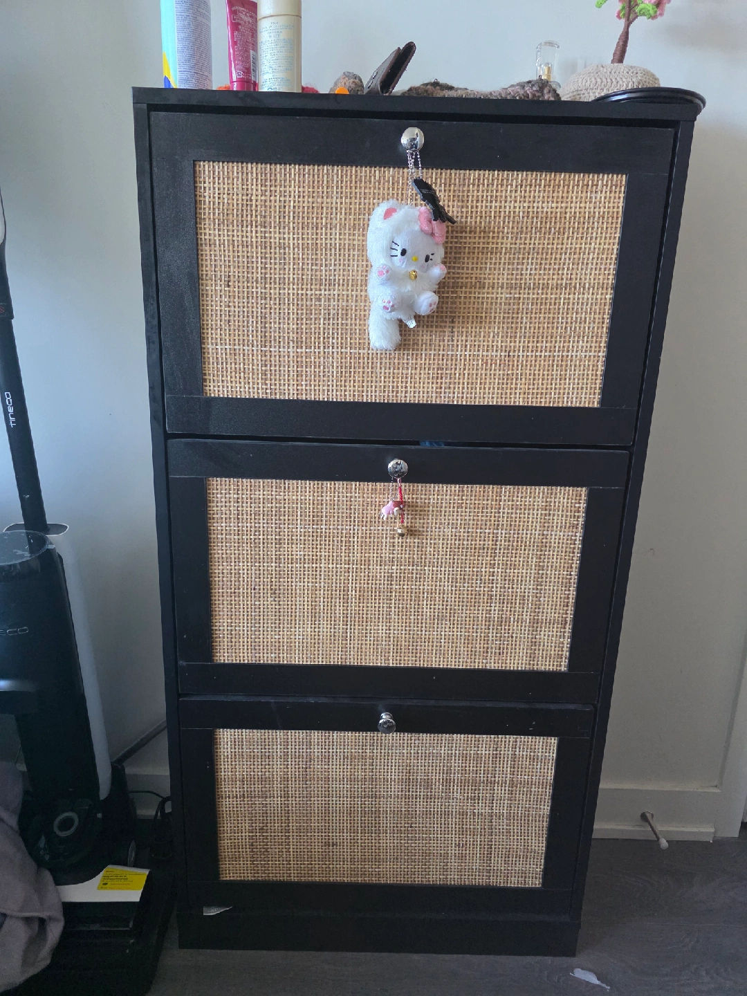 Selling a HOMCOM Boho Rattan Shoe Cabinet in black. It has 3 flip drawers and adjustable shelves. It's a narrow shoe storage cabinet that holds 18 pairs. Dimensions are 45.3" (115 cm) height, 21.5" (54.5 cm) width, and 9.3" (23.5 cm) depth. It weighs 88 lbs (40 kg).