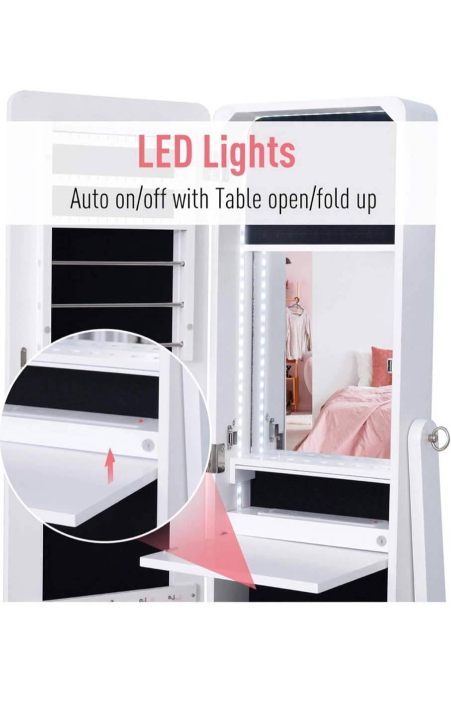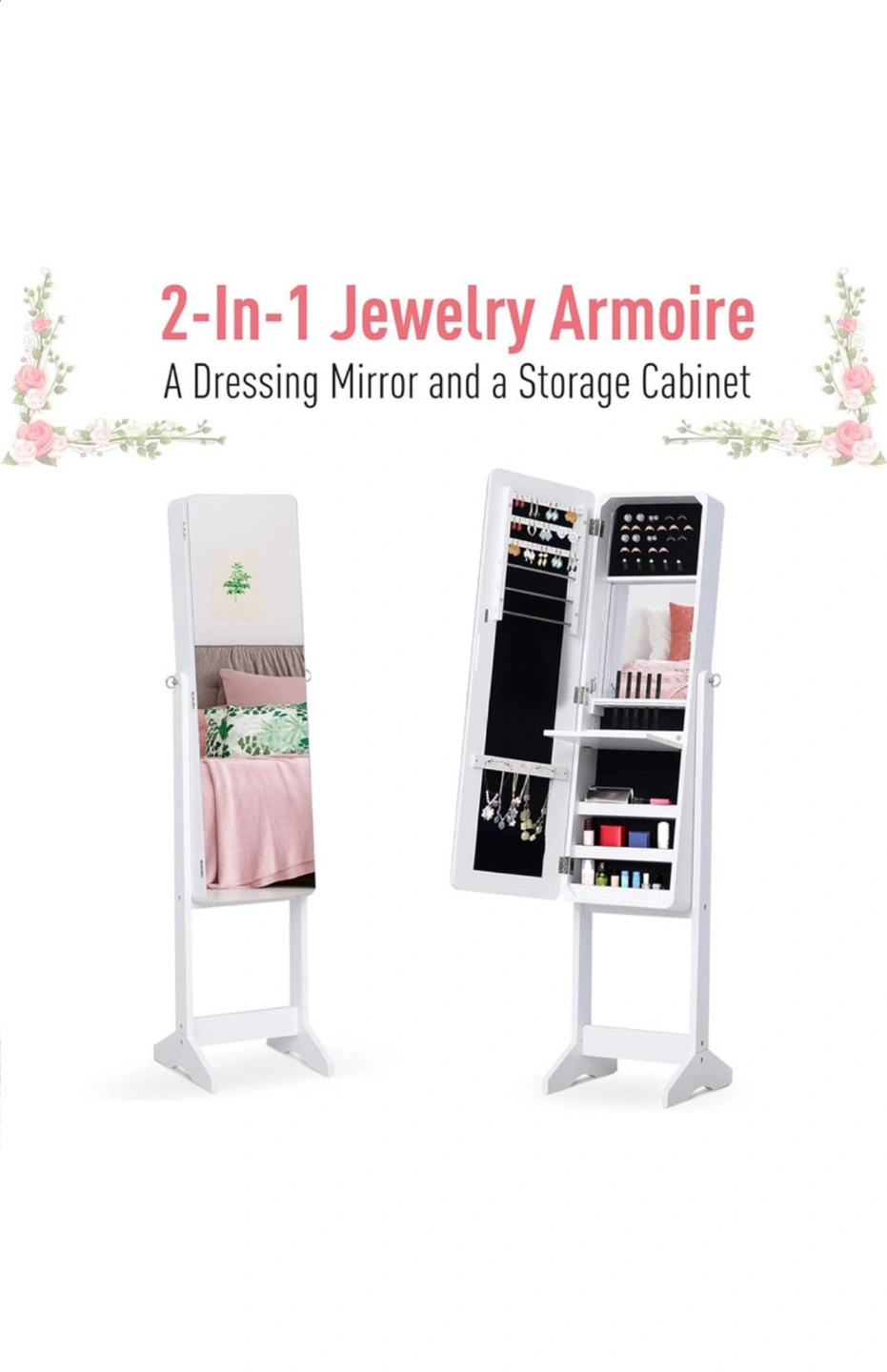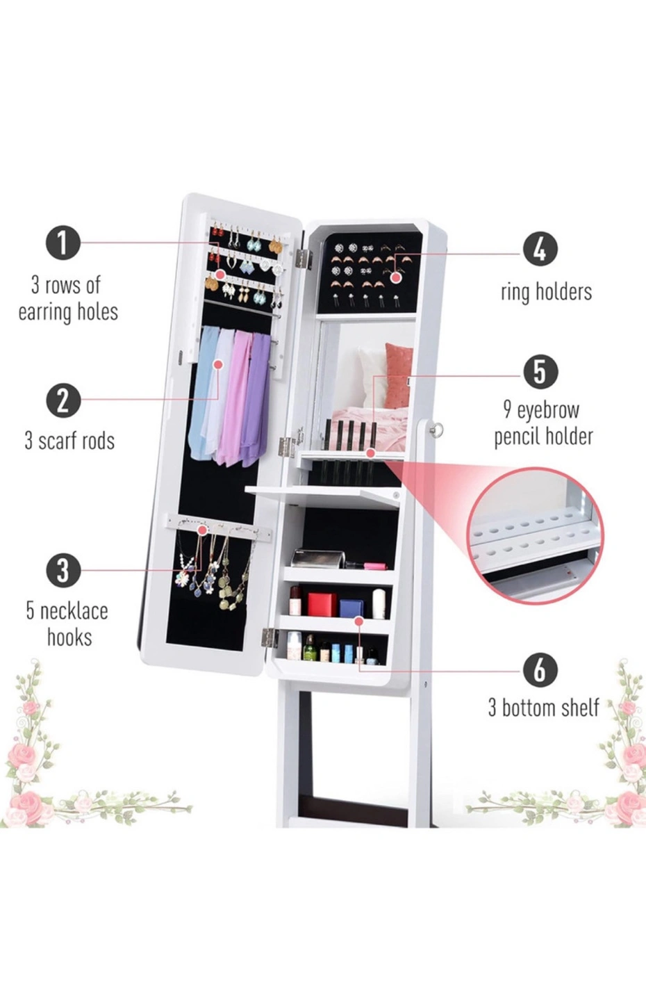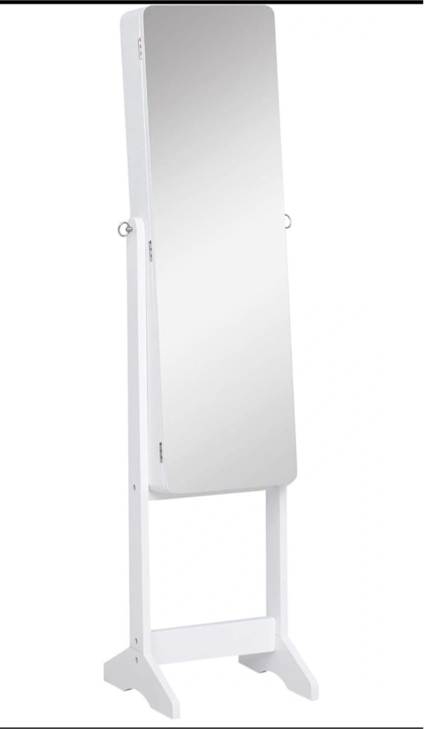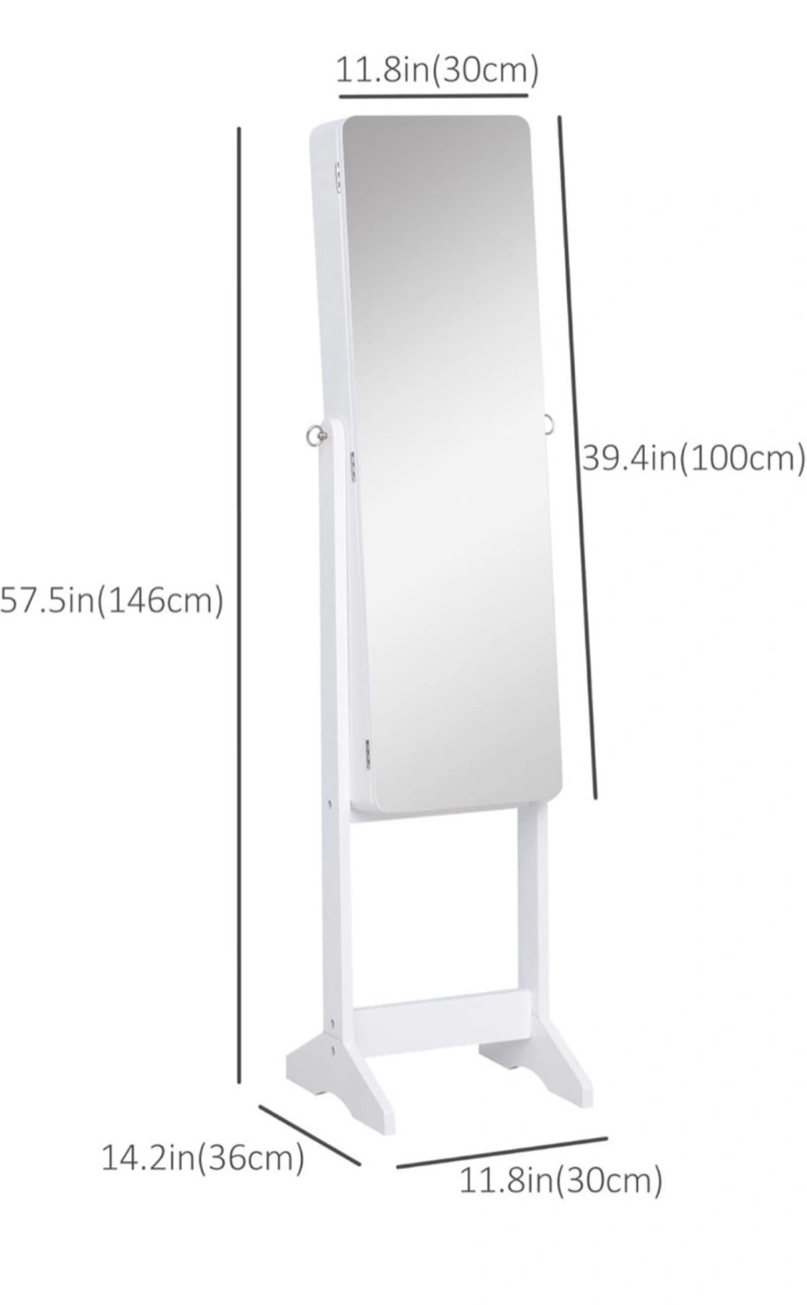 79My price is 90$ HOMCOM Freestanding Mirrored Jewelry Cabinet Msrp = 140 + Tax Store Pickup – Gizmos Hut 📍 22 Chestermere Cres, Brampton, ON L7A 2E8 📞 +1 (647) 716‑6622 [Big Moe] Please Note: This is a residential pickup point. Kindly park at the front and ring the doorbell, or contact us upon arrival. Pickup Hours: • Monday to Friday: 8:00 AM – 11:30 PM • Saturday: 9:00 AM – 11:00 PM • Sunday: 9:00 AM – 11:30 PM Free-Standing Jewelry Cabinet: The standing mirror with storage is the perfect way to organize all your jewelry and accessories. Ideal for living room, powder room and more. Perfect for birthdays, valentine's days, and other special occasions for your lover, daughter, or friends. LED Light: LED light strip inside the jewelry mirror cabinet automatically turns ON/OFF when the foldable small table opens or closes. Lights give a beautiful look inside the jewelry mirror. Glass Mirrors: Full length mirror at the front offers a full body view of your outfit and the jewelry organizer also includes a small mirror inside. Adjustable angles provide more convenience. As the frame is thick and strong, it won't warp or break easily. Ample Storage Space: The jewelry armoire comes with 3 bottom shelf, 3 rows of earring holes, 5 necklace hooks, 3 scarf rod, a storage bag, ring holders, 9 Eyebrow pencil holder and a fold up table, ideal for holding all your important jewelries and other accessories. Product Information: Overall Dimension: 11.75"W x 57.5"H x 14.25"D, Cabinet Size:11.75" W x 39.25" H x 4.75"D, Weight Capacity: 24.6lbs. #TW-1651-(1239,110)-R-22