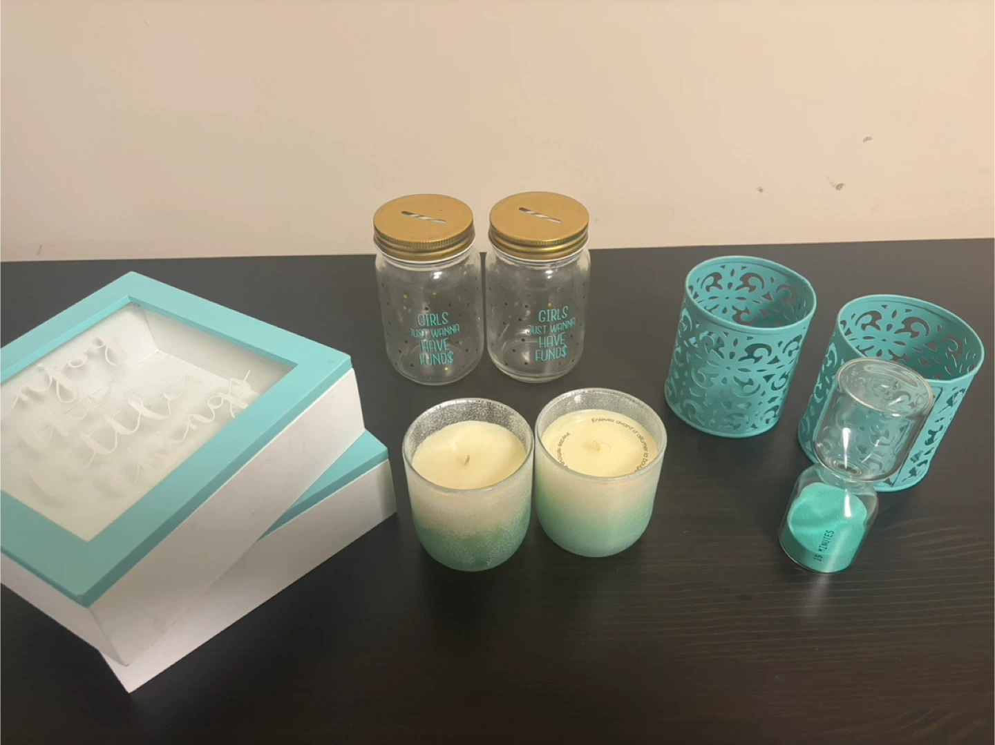 10Selling a cute collection of home decor items! You'll get a variety of teal-themed pieces, including: - Two glass jars with gold lids and "Girls Just Wanna Have Funds" text - Two teal woven baskets - Two ombre teal candles - A decorative box with a quote - A small hourglass Perfect for adding a touch of colour to your space!