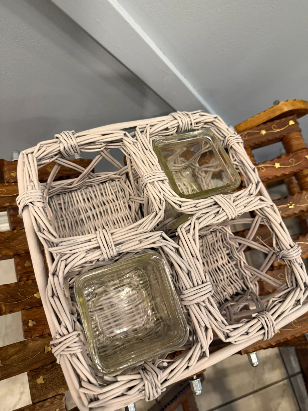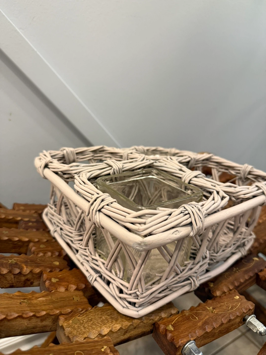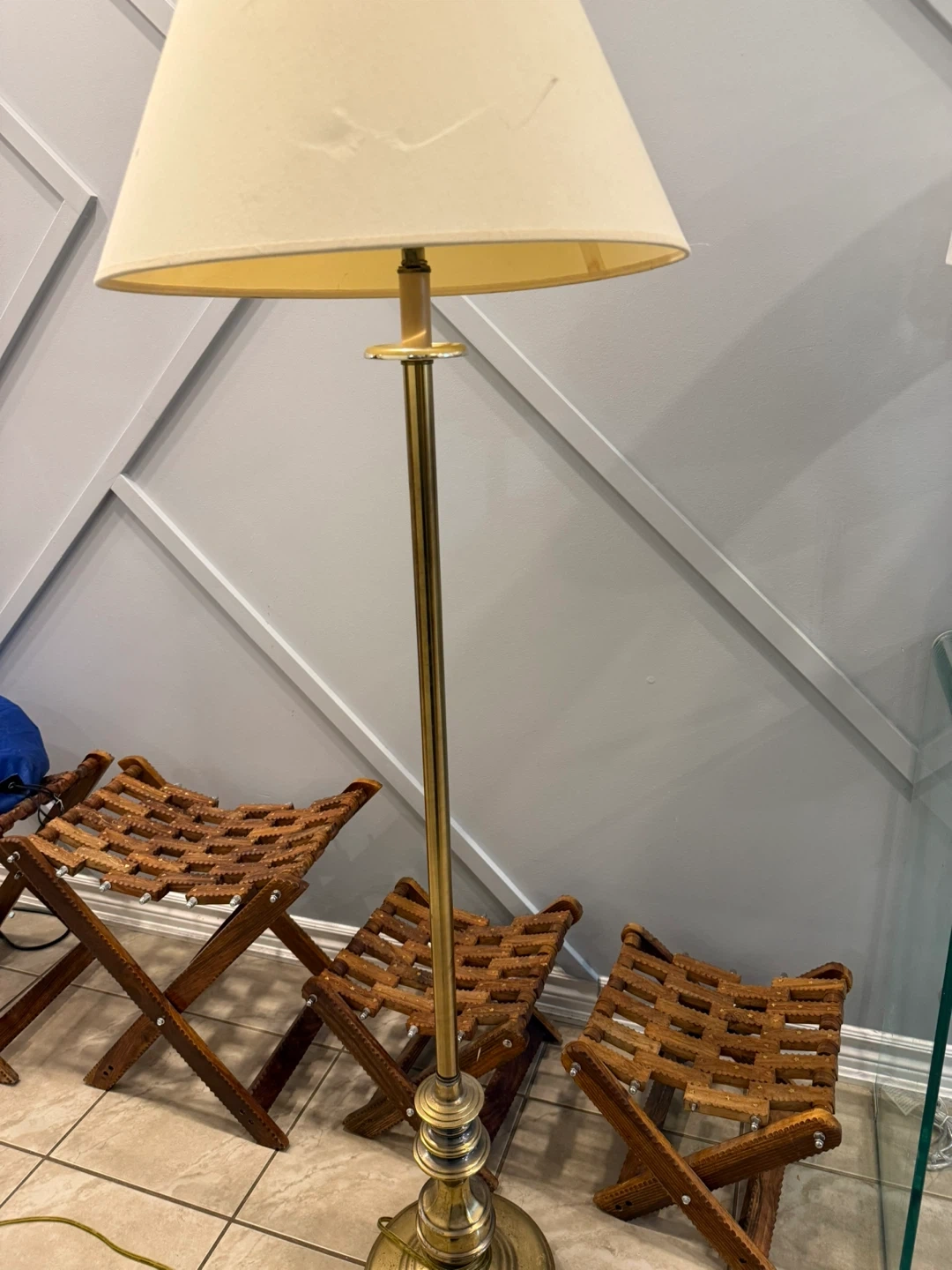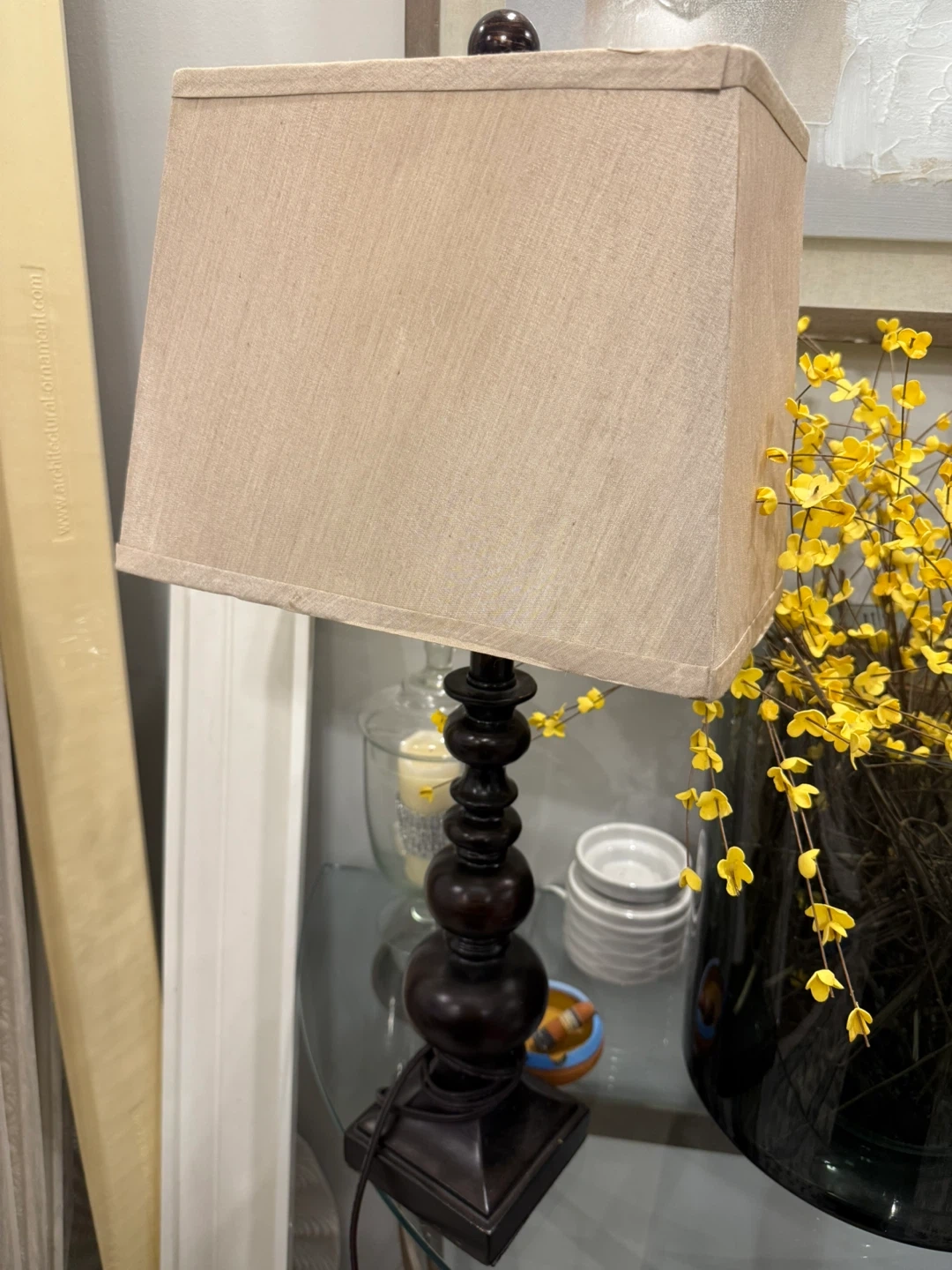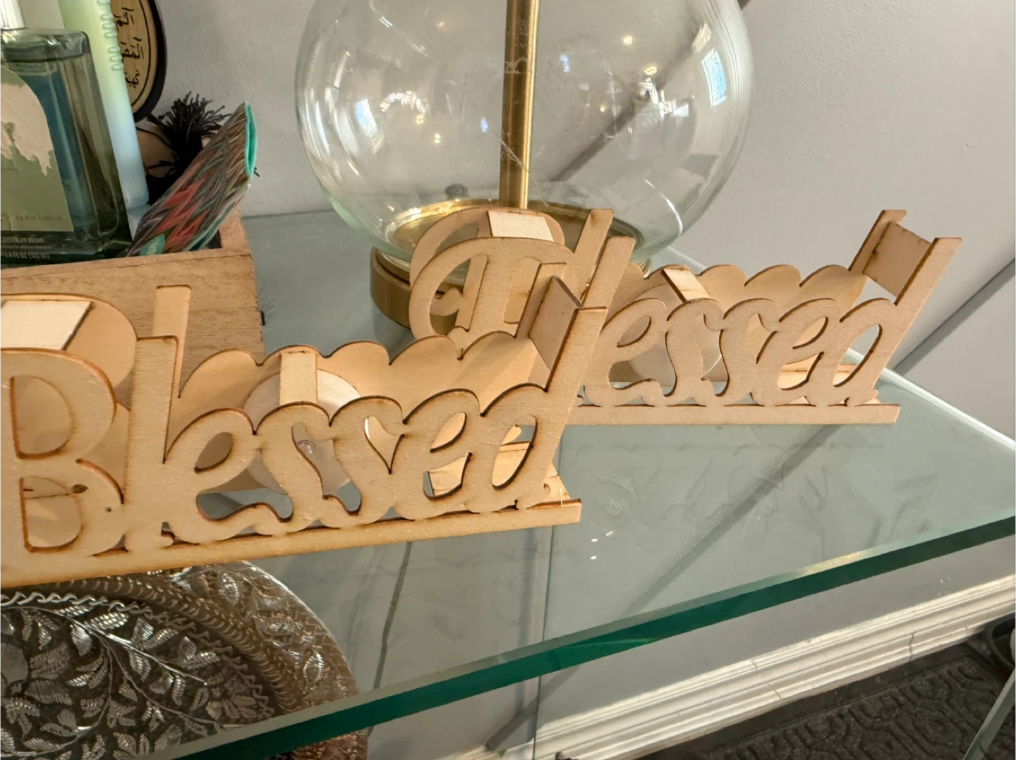A collection of home decor items. Includes a floor lamp with a beige shade, a woven basket with glass inserts, and decorative wooden 'Blessed' signs. Perfect for adding a touch of warmth and style to your home