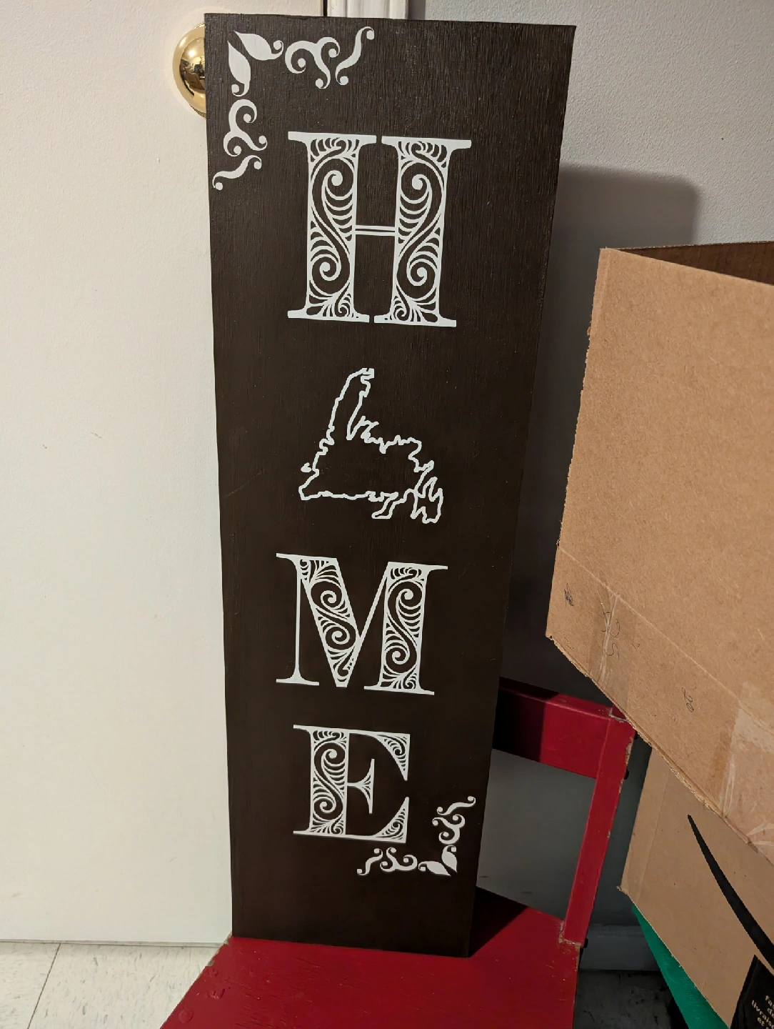 98Moving the Weekend Must Go! Cute home decor sign. It is brown with white lettering that spells out HOME, with the silhouette of Newfoundland in place of the O. Perfect for anyone who loves Newfoundland!