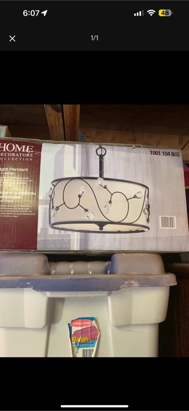Selling a Home Decorators Collection light pendant! It features a fabric shade and space for three E26 60-watt lightbulbs. The dimensions are 40.64cm x 40.64cm $75 OBO Check out my other listings and bundle items!