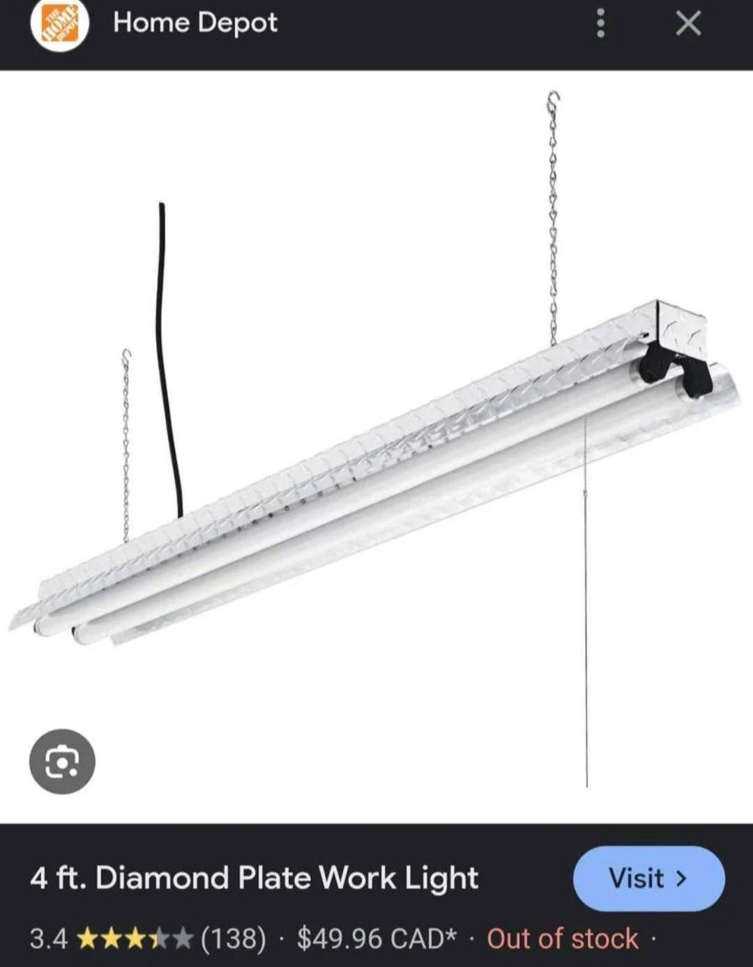 15Selling a 4 ft. Diamond Plate Work Light from Home Depot. It was originally bought for $49.96 CAD. 2 available 40. for both
