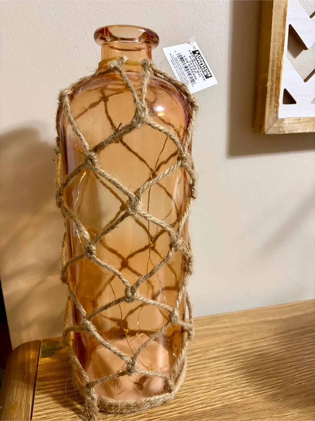 26Add a touch of coastal charm to your home with this Home Trends lighted vase! The vase is a beautiful amber color and features a decorative rope netting. It requires 3 AAA batteries to light up, creating a warm and inviting ambiance