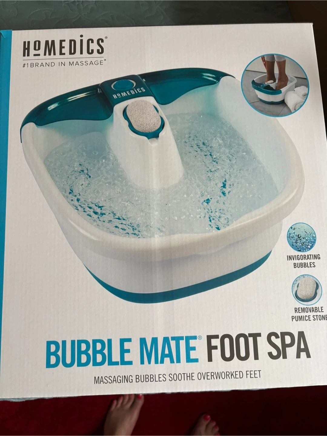 60Treat your feet with this HoMedics Bubble Mate Foot Spa! It's in like-new condition and comes in its original box. Features include: - Invigorating bubbles to soothe overworked feet - Removable pumice stone for exfoliation - Soothing heat to help maintain warm water temperature
