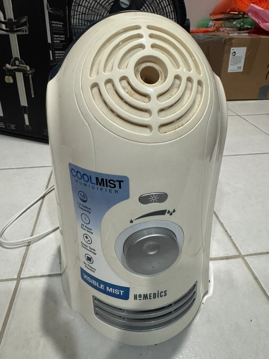 I'm selling a HoMedics Cool Mist Humidifier! It has a 1.0-gallon capacity and can run for up to 48 hours. The humidifier also features a clean tank technology and no filters are required. It creates a visible mist to help add moisture to the air