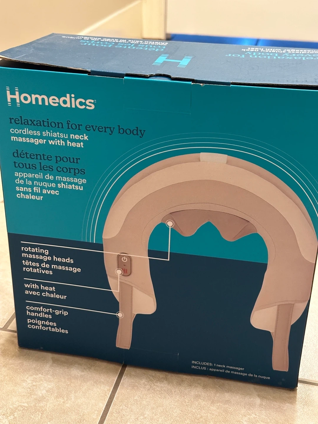 Selling a Homedics cordless shiatsu neck massager with heat. It's designed for relaxation for everybody. It features rotating massage heads and comes with heat for added comfort. Includes comfort-grip handles. The box is included