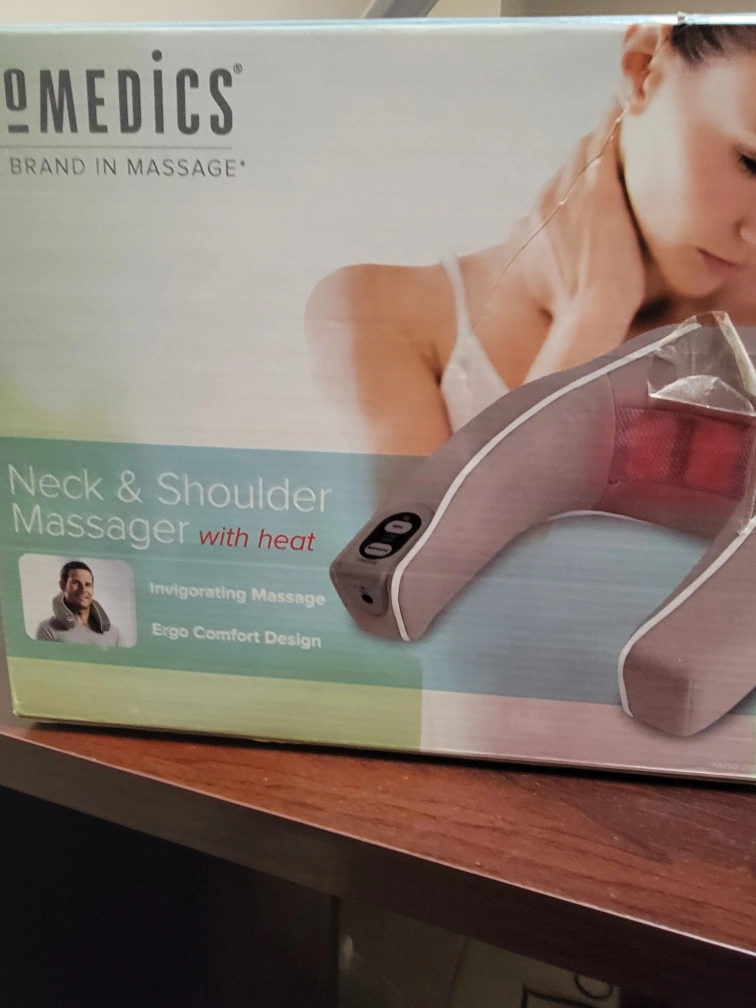 20Selling a brand new HoMedics Neck & Shoulder Massager with Heat. It features an invigorating massage and ergo comfort design. It has heat settings (low and high) and massage settings. The box is included