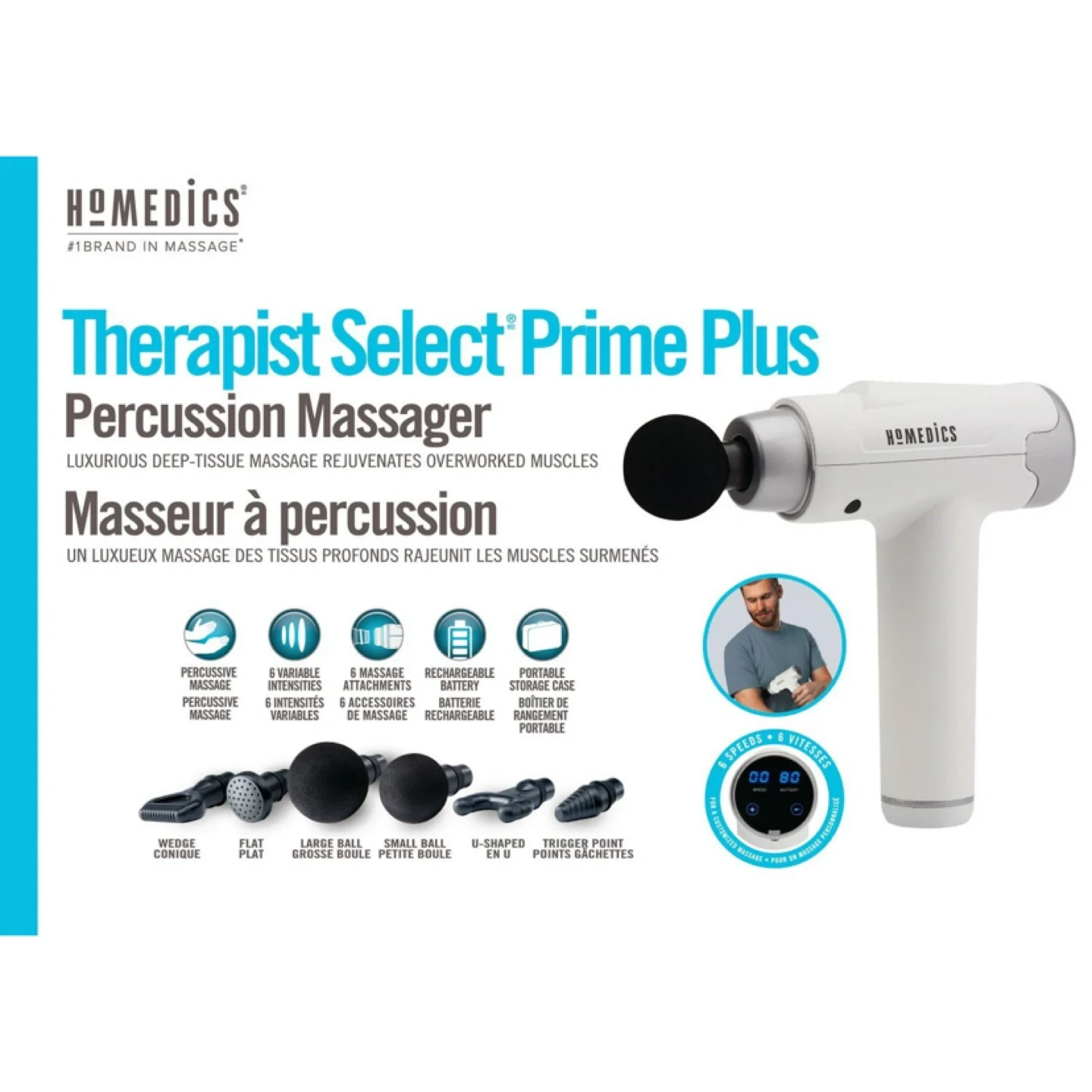 Get ready to rejuvenate overworked muscles with this HoMedics Therapist Select Prime Plus Percussion Massager! It features: - 6 variable intensities - 6 massage attachments - Rechargeable battery - Portable storage case Enjoy a luxurious deep-tissue massage right at home