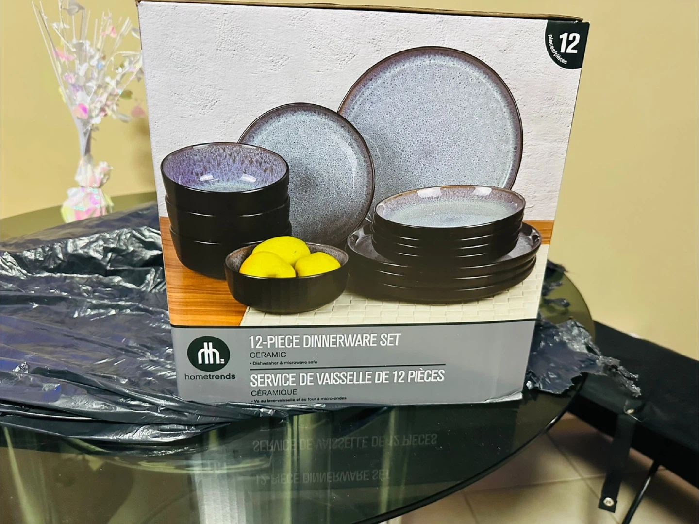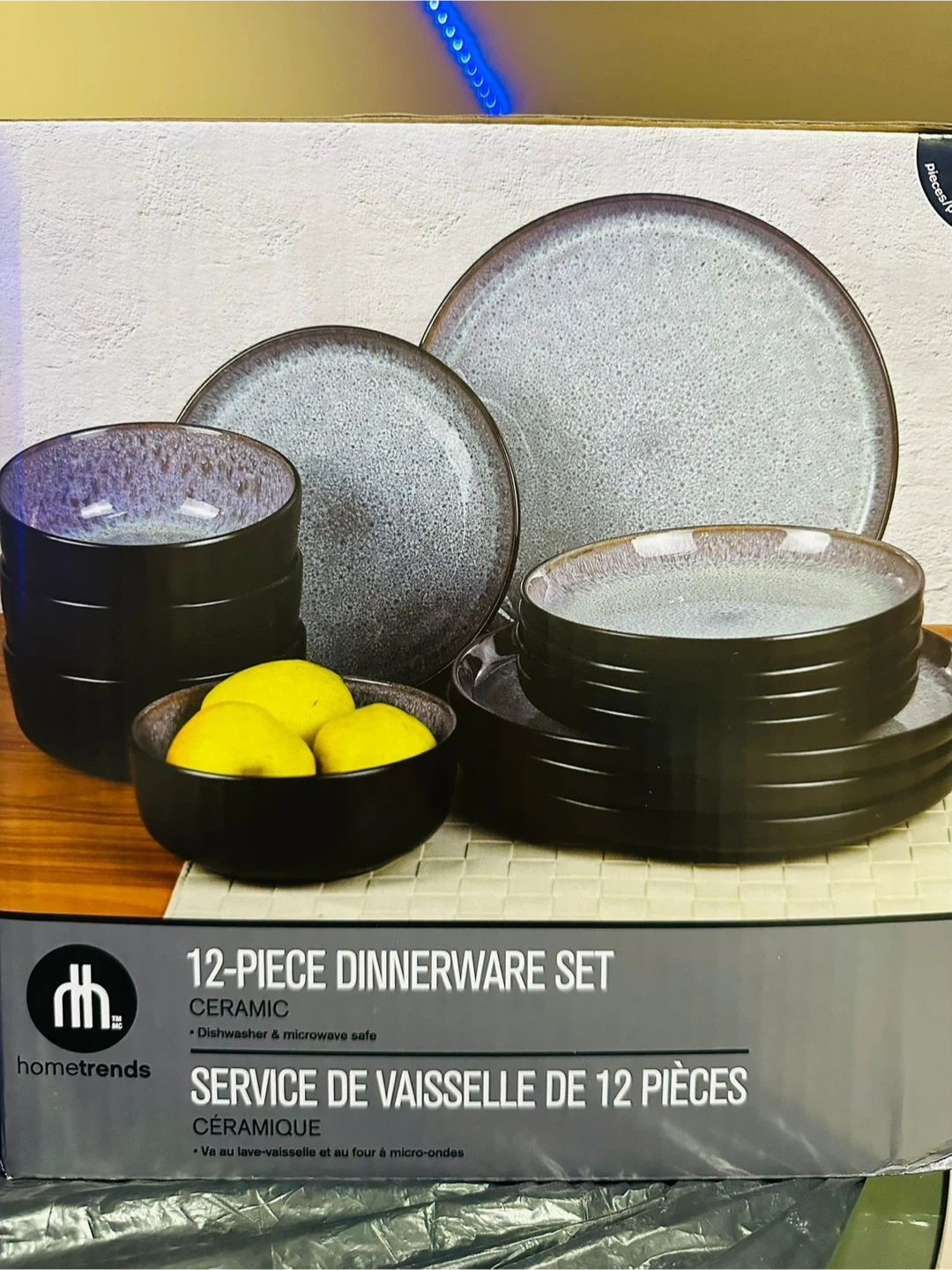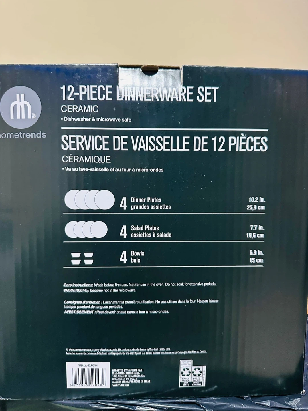 33Selling a brand new hometrends 12-piece ceramic dinnerware set! This set is dishwasher and microwave safe. It includes 4 dinner plates (10.2 in / 25.9 cm), 4 salad plates (7.7 in / 19.6 cm), and 4 bowls (5.9 in / 15 cm).