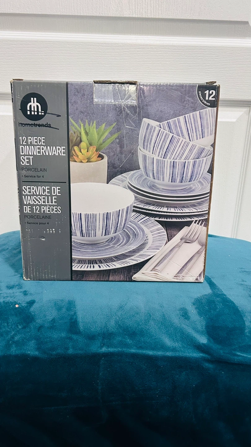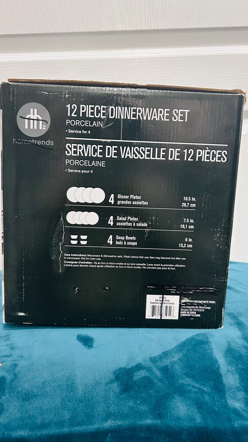 65Selling a hometrends 12-piece dinnerware set, service for 4. The set is porcelain and includes: - 4 dinner plates (10.5 in / 26.7 cm) - 4 salad plates (7.5 in / 19.1 cm) - 4 soup bowls (6 in / 15.2 cm) Microwave and dishwasher safe!