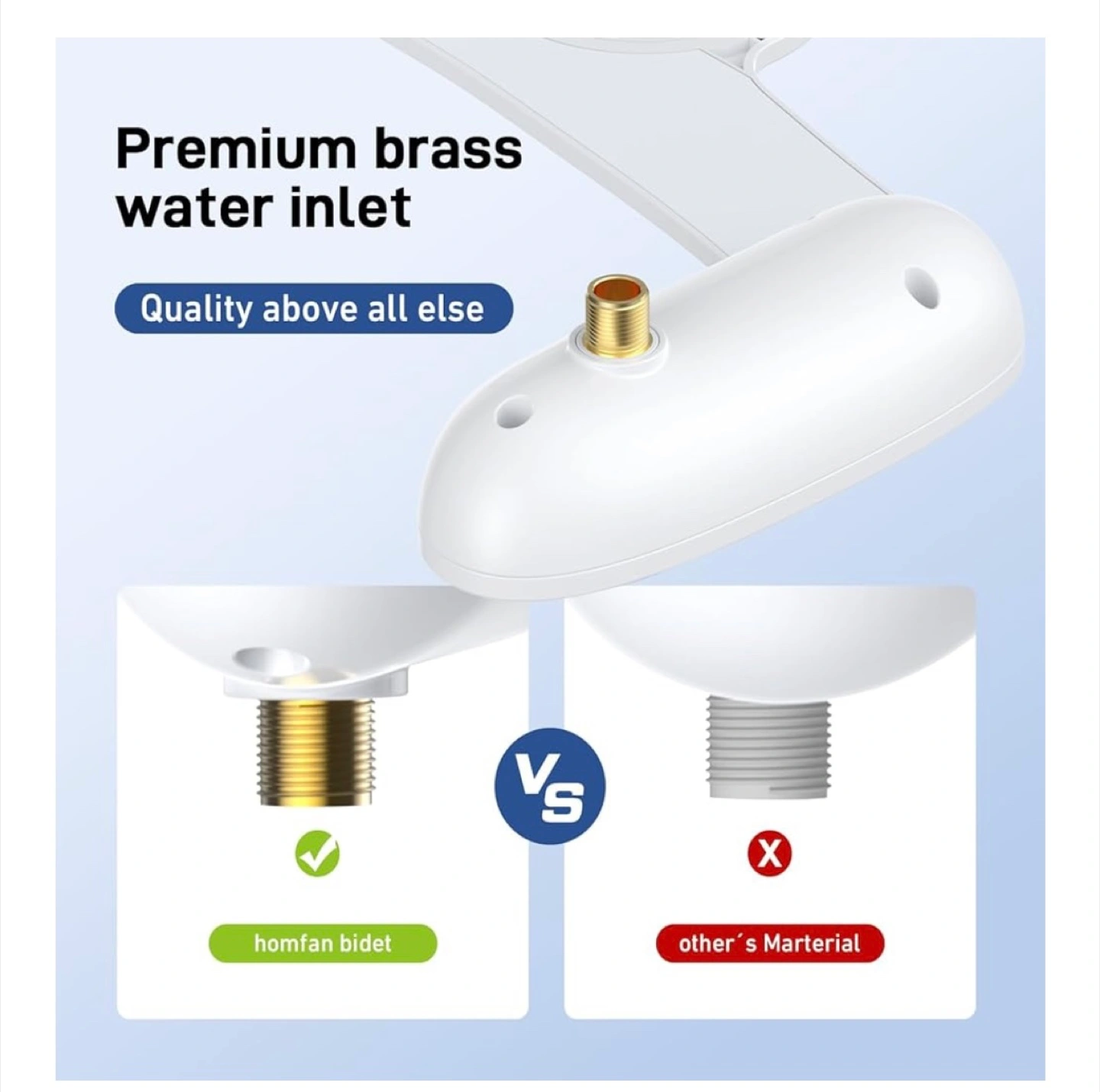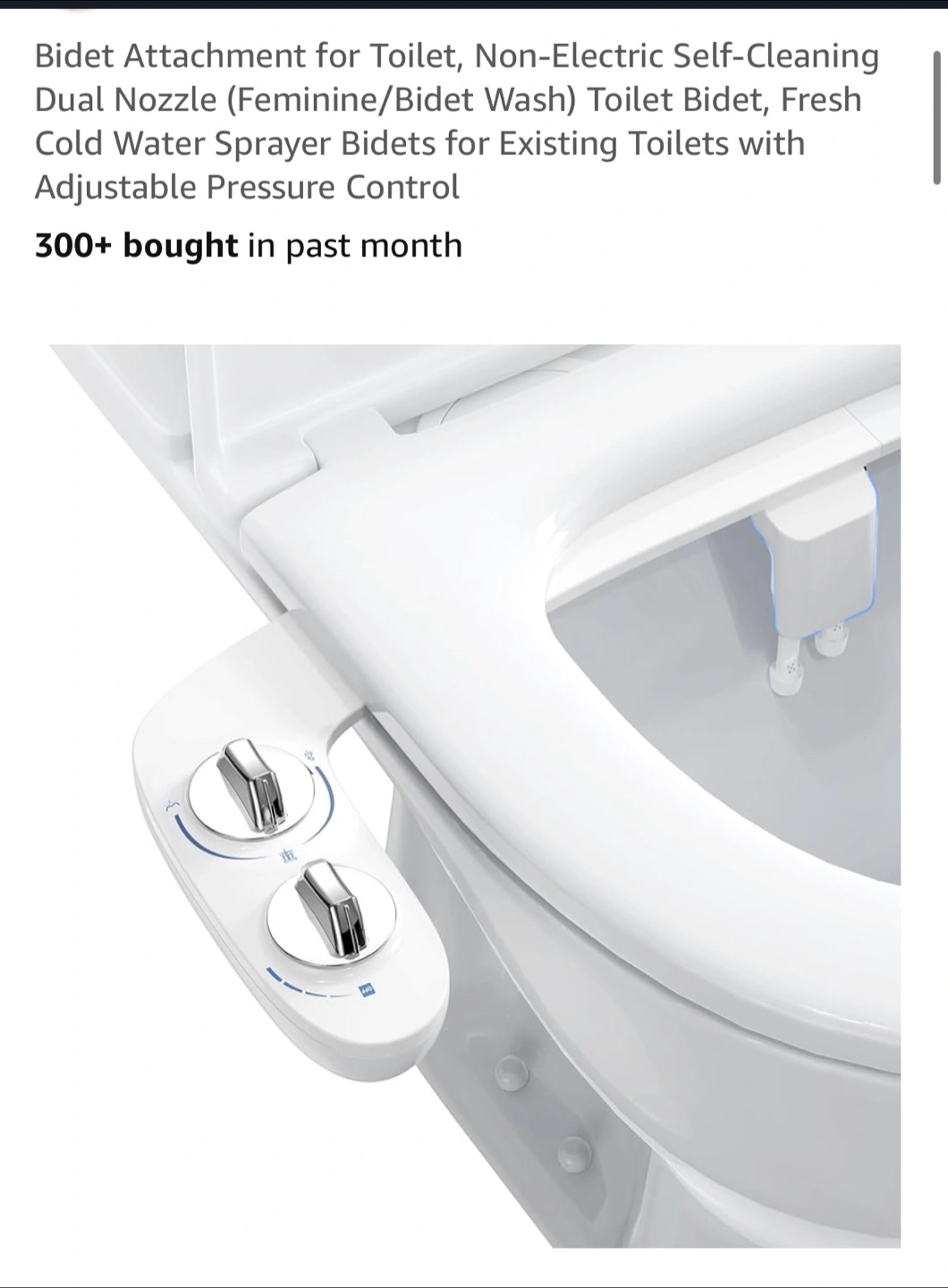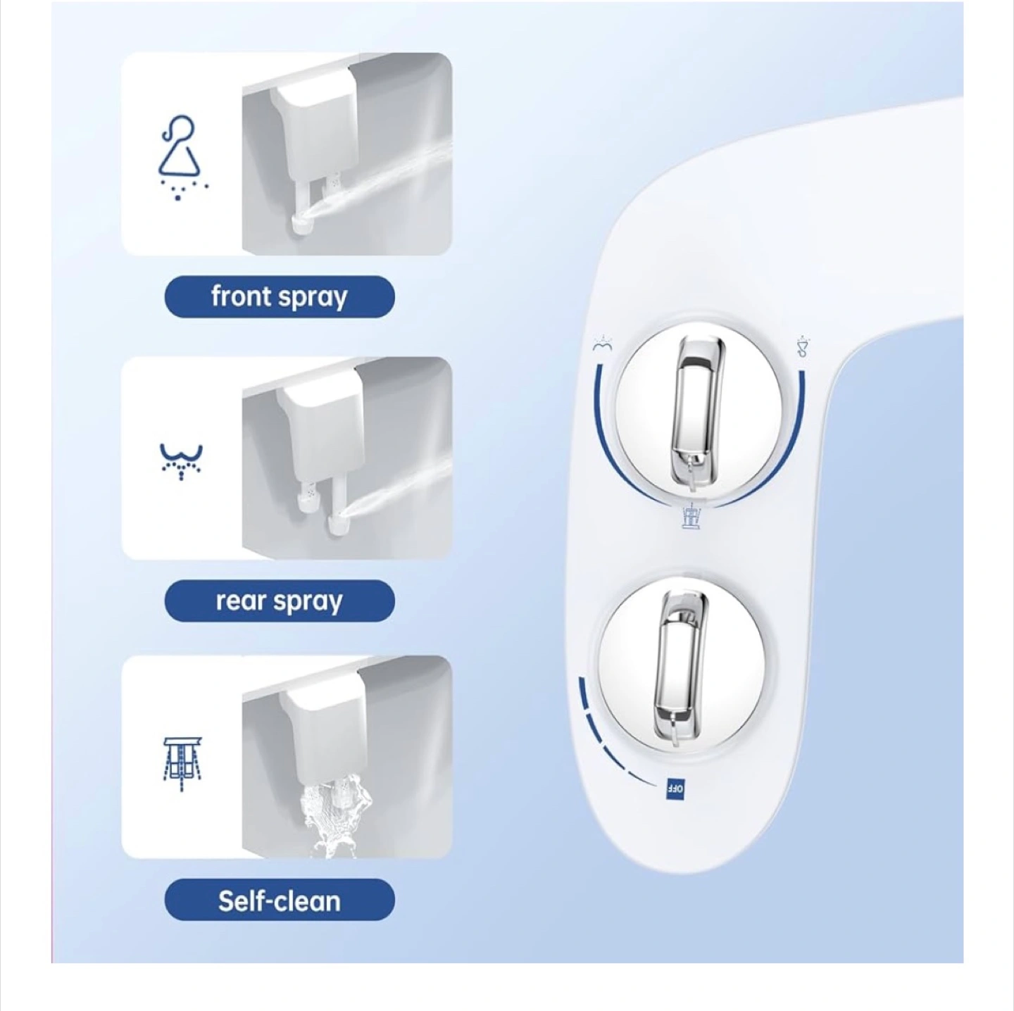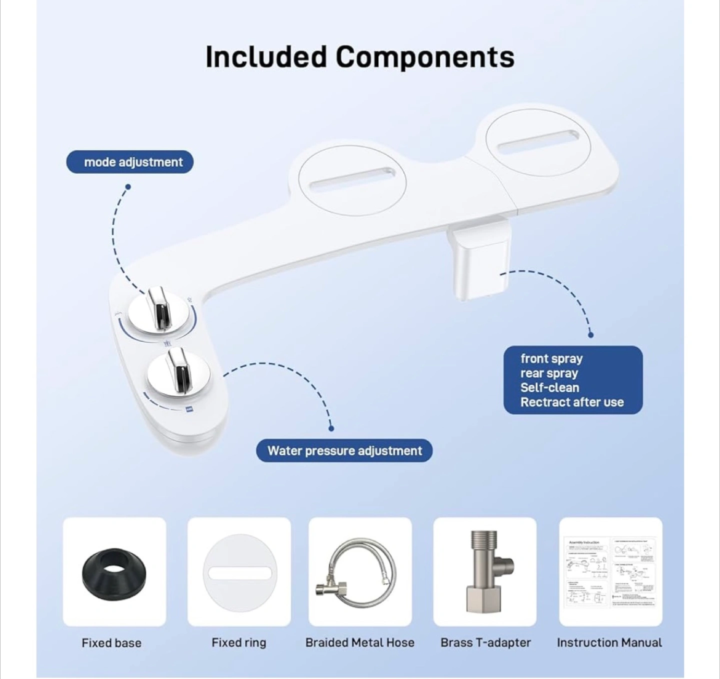 This Homfan bidet attachment is a great addition to any bathroom! It features: - Front and rear spray nozzles - Self-cleaning function - Adjustable water pressure - Premium brass water inlet It's a non-electric, self-cleaning dual nozzle bidet with adjustable pressure control. Includes all components for installation: fixed base, fixed ring, braided metal hose, brass T-adapter, and instruction manual