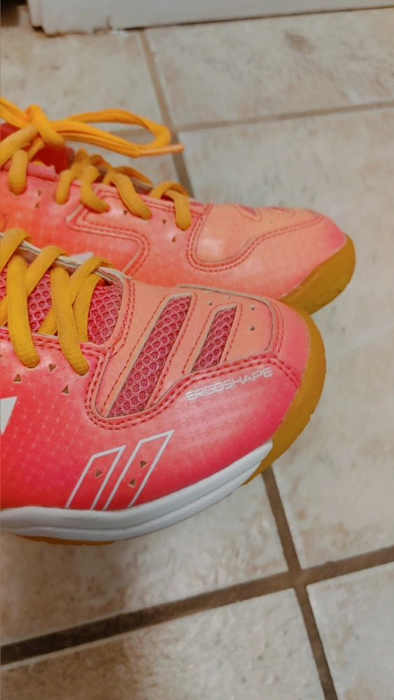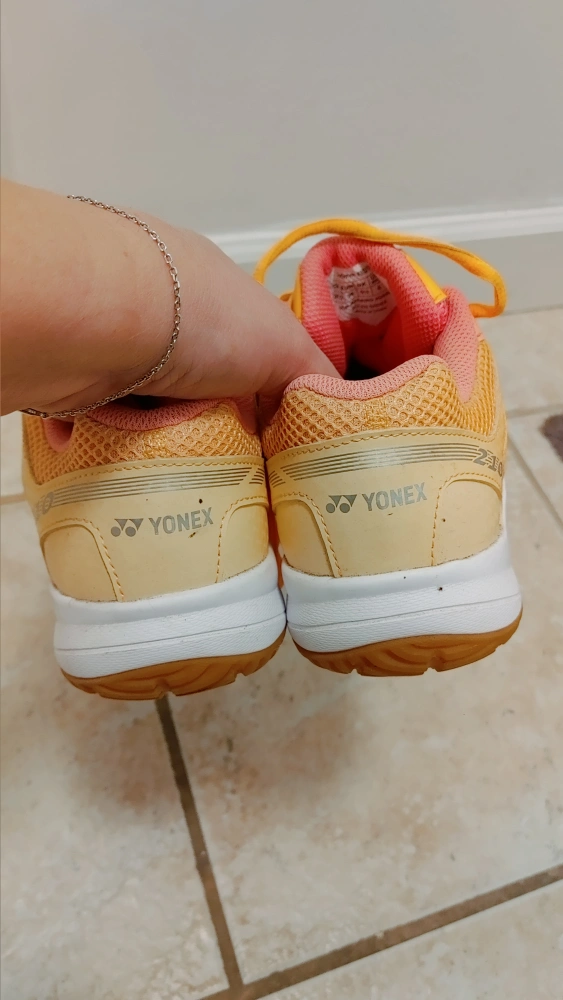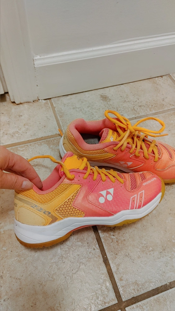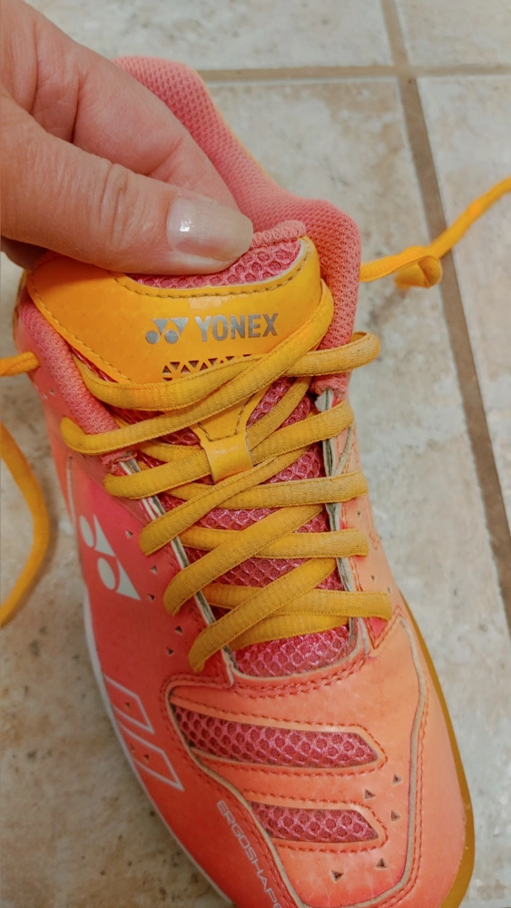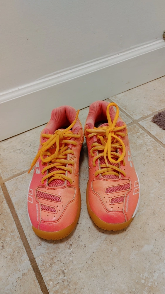 Yonex shoes in a vibrant pink and orange colourway. These shoes feature a lace-up closure for a secure fit. Excellent condition