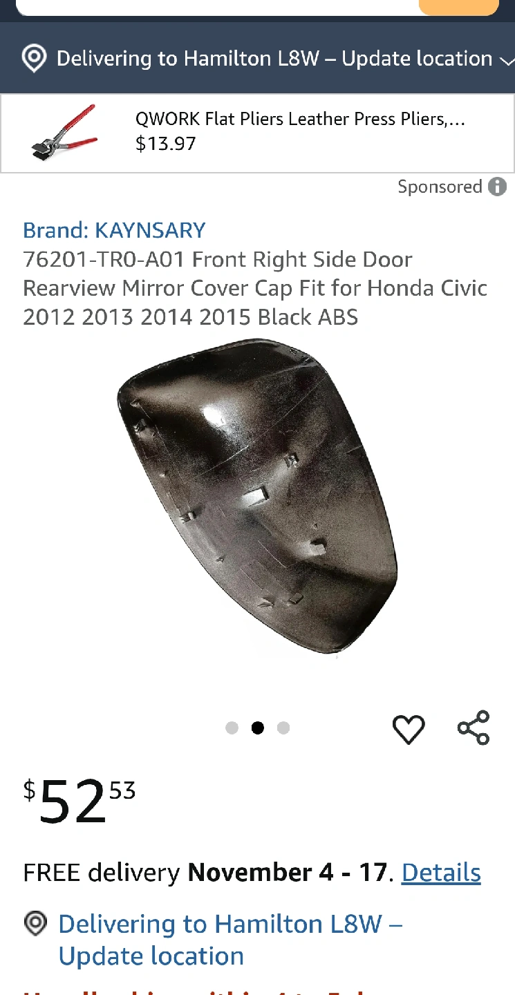 10Selling a mirror cap cover in black. Compatible with Honda Civic models from 2016 to 2021. Part numbers include 76251-TBA-A11ZF and 76251-TBA-A21ZG.