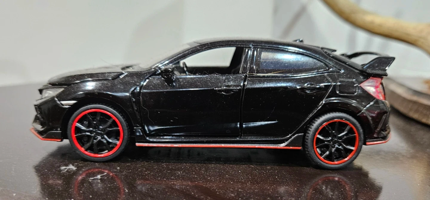 67Selling a diecast model of a Honda Civic Type R. It's black with red accents on the wheels and body. A cool collectible for car enthusiasts! Lights and sound. New as displayed only so dusty