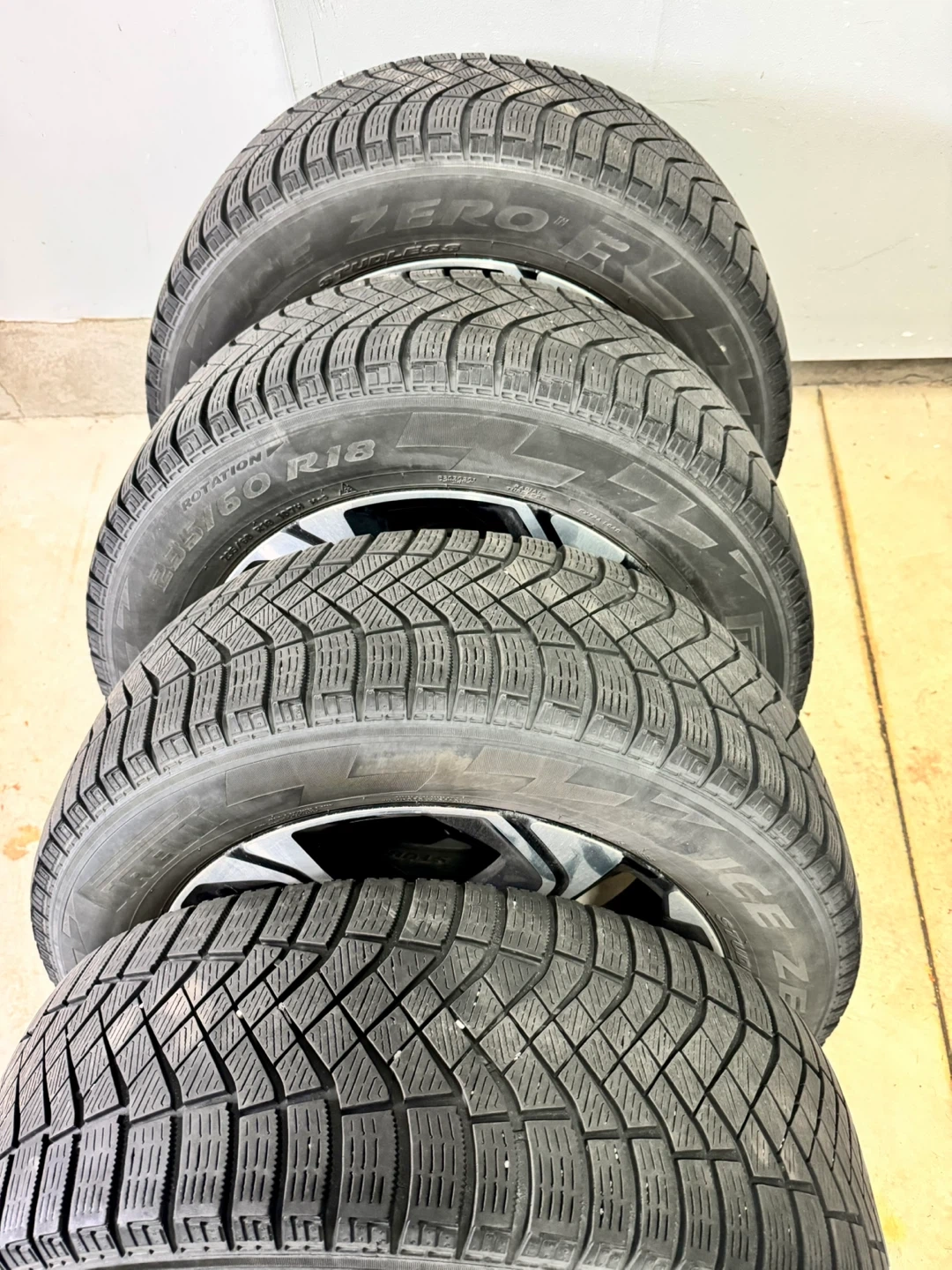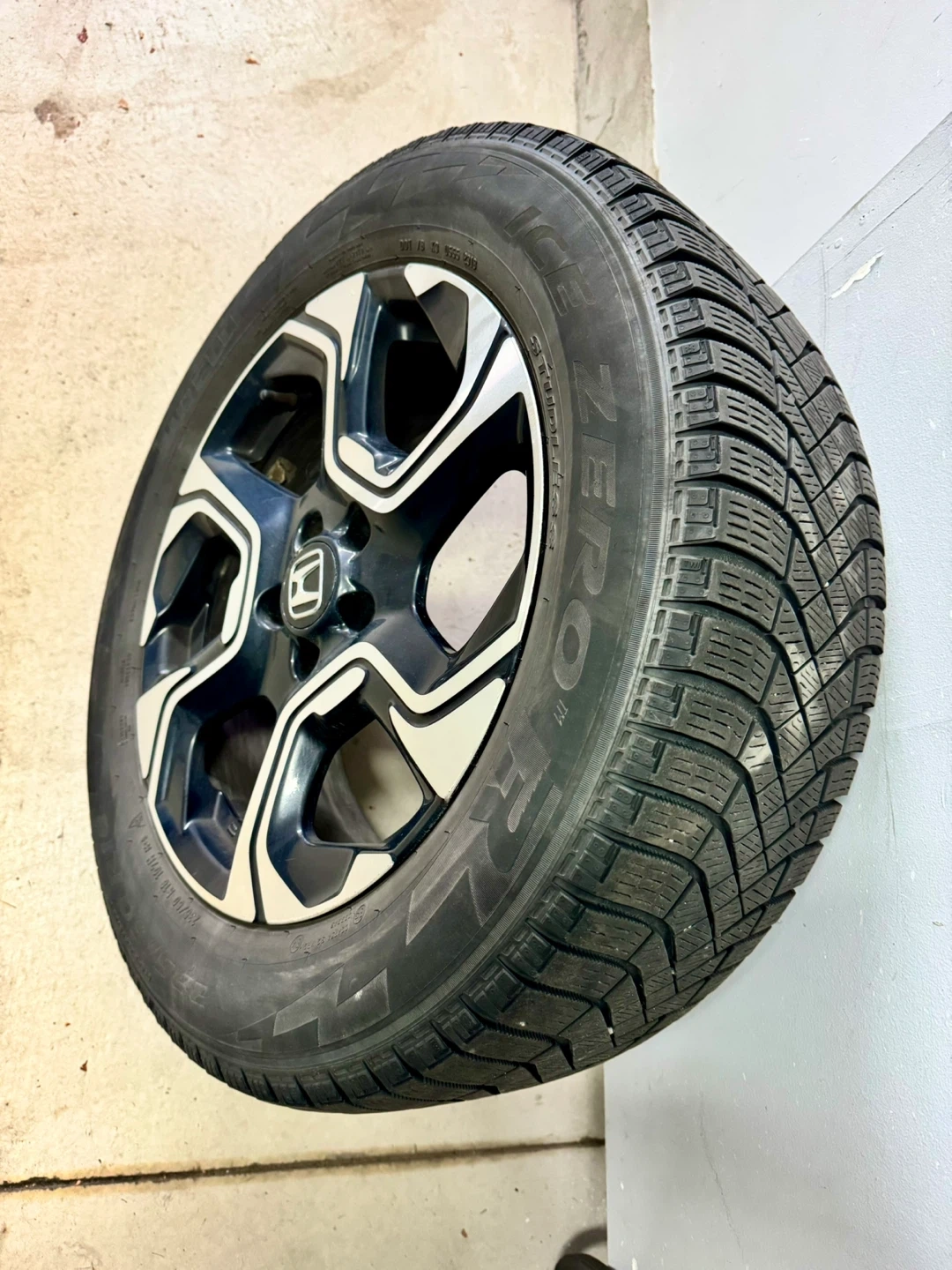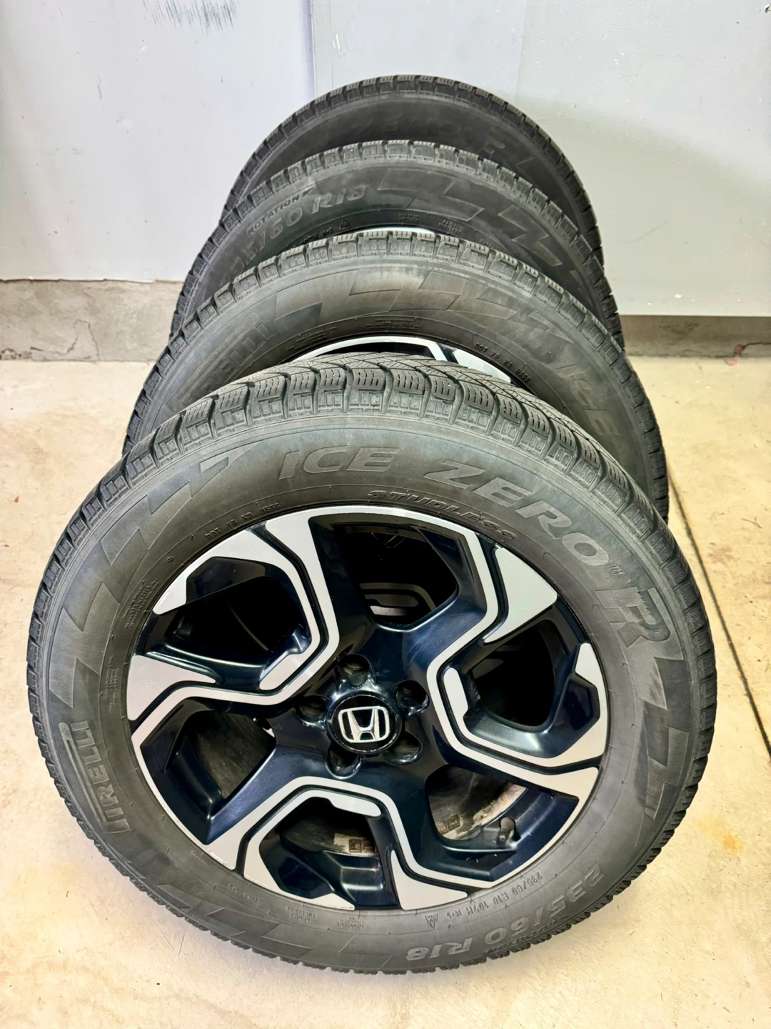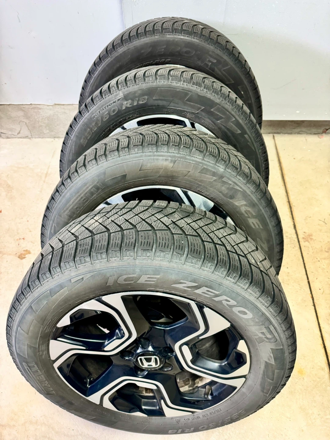 60Pirelli Ice Zero FR Winter Tires on Honda OEM Alloy Rims Details: • Model: Pirelli Ice Zero FR • Type: Winter (Studless) • Size: 235/60 R18 • Mounted on: Genuine Honda alloy rims Description: Premium winter tires in excellent condition, mounted on stylish Honda alloy wheels. ✅ Tread Condition: • Deep, sharp tread blocks with clear zig-zag sipes. • No signs of balding, cracking, or dry rot. • Even wear, stored properly off-season. 📏 Estimated Wear: Approximately 10–20% used, with 80–90% tread life remaining — plenty of winters ahead.