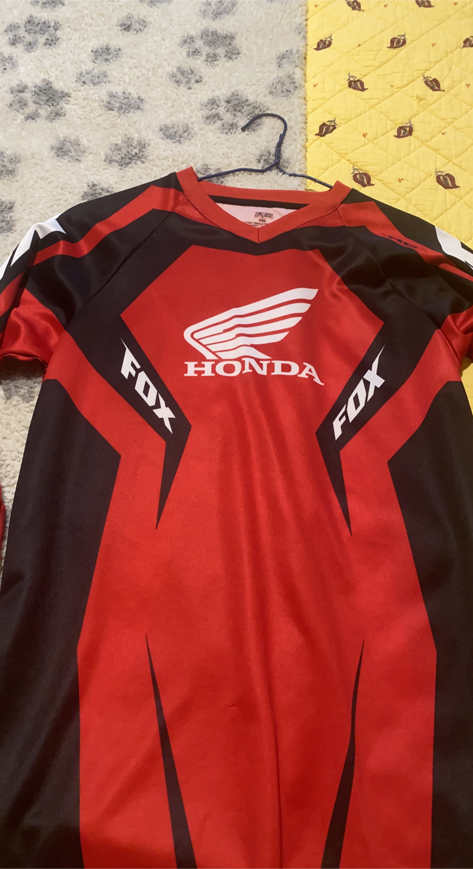 Red and black colours, with white accents. Featuring the logos of Honda and Fox. Perfect for adding to your collection.