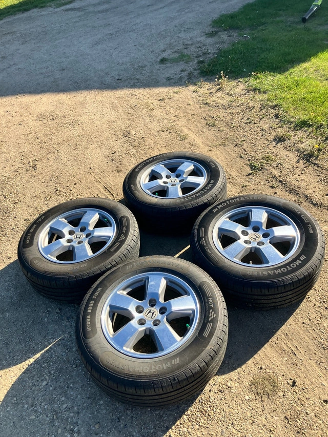 60For sale is a set of four Honda rims with Motomaster Hydra Edge Tour tires, sized at 245/65R17, suitable for a range of Honda vehicles. These used rims are in good condition, and the tires have a good amount of tread left, as you can see from the pictures. They are ready to be mounted and will provide a smooth and reliable ride. Additional details include: Tire Pressure Monitor, Tire Brand: Motomaster, Tire Size: 245/65R17, Rim Size: 17 inches, Bolt Pattern: 5x120mm (common Honda pattern). If the ad is up, they are still available!
