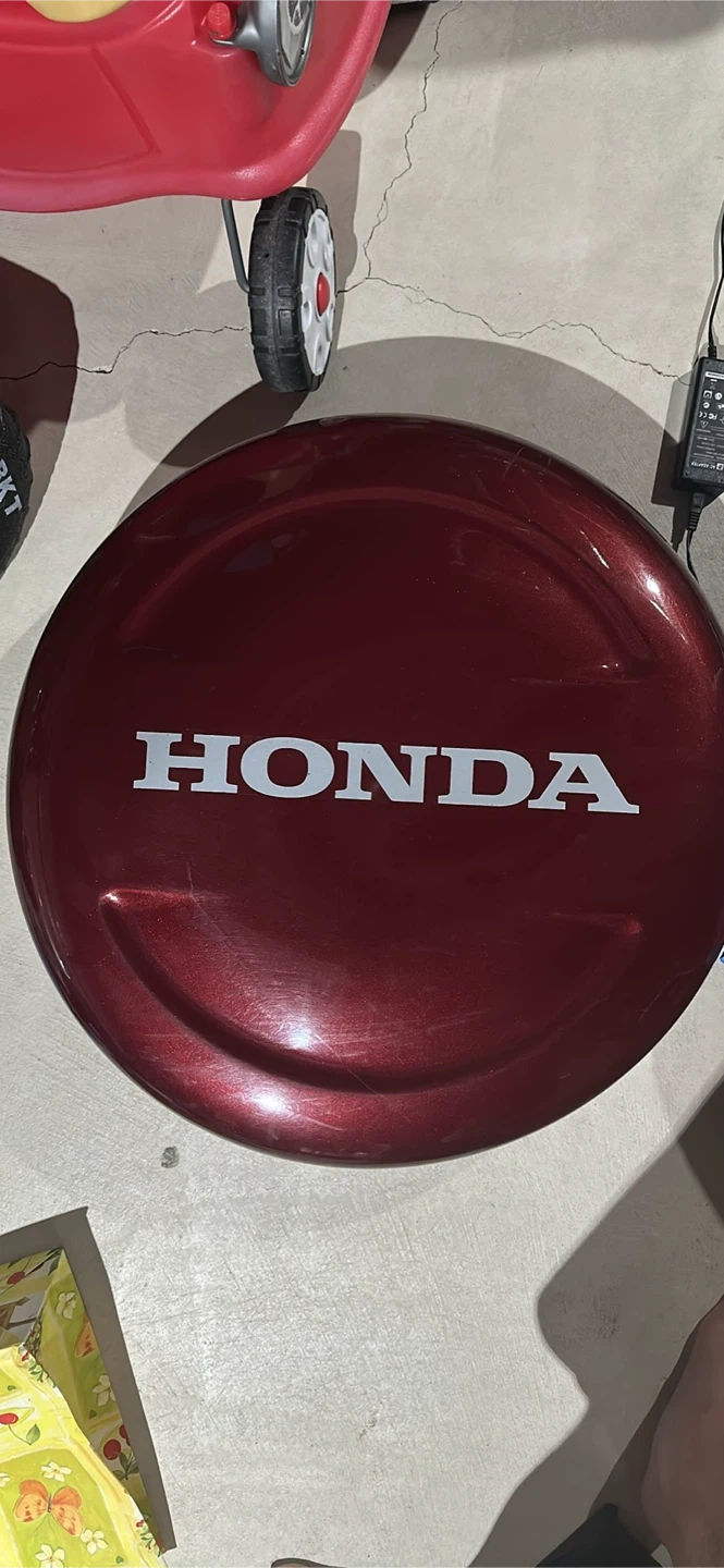 Selling a Honda spare tire cover in burgundy! It's in great shape and ready to protect your spare tire. The cover features the Honda logo prominently on the front.