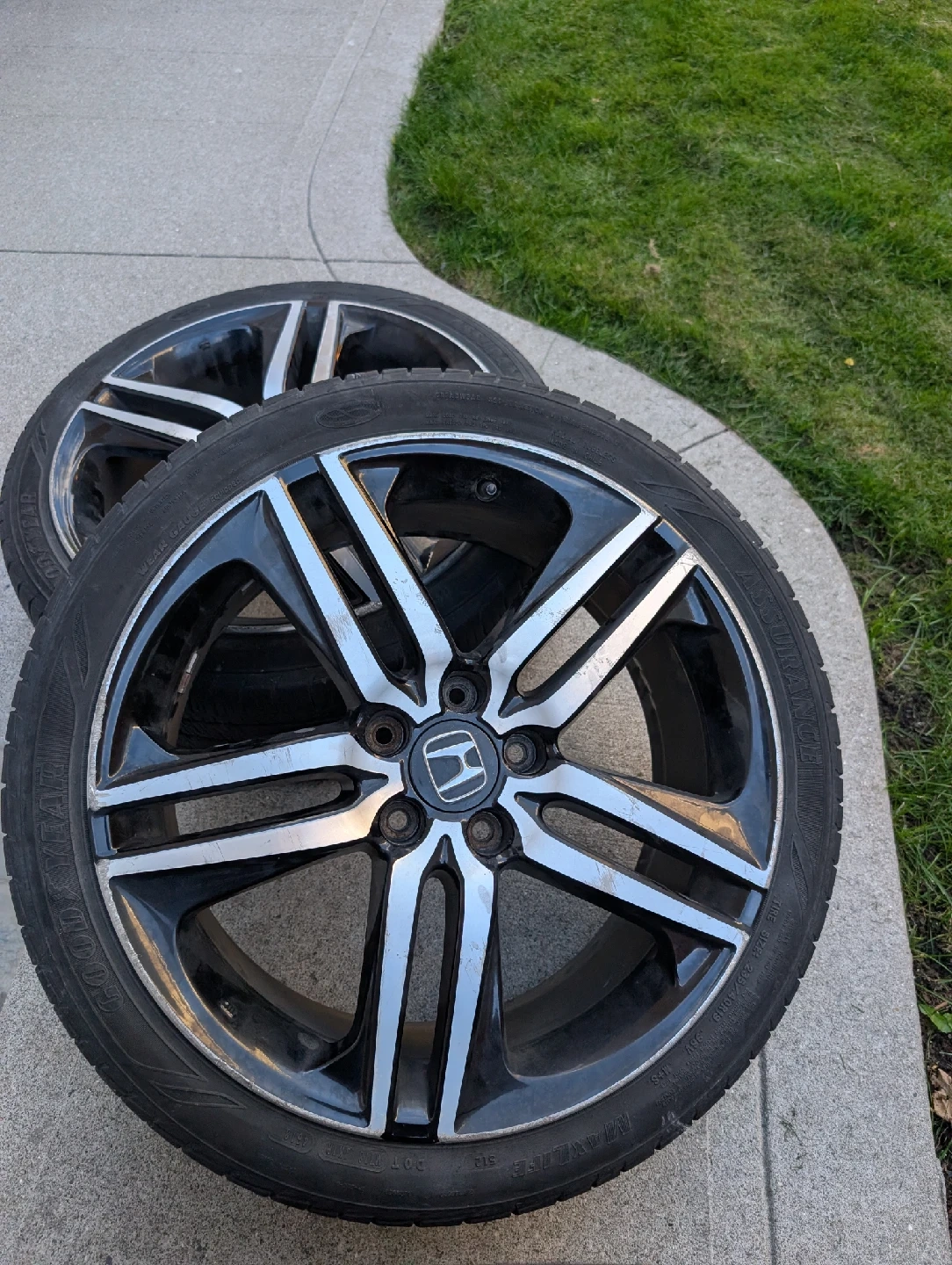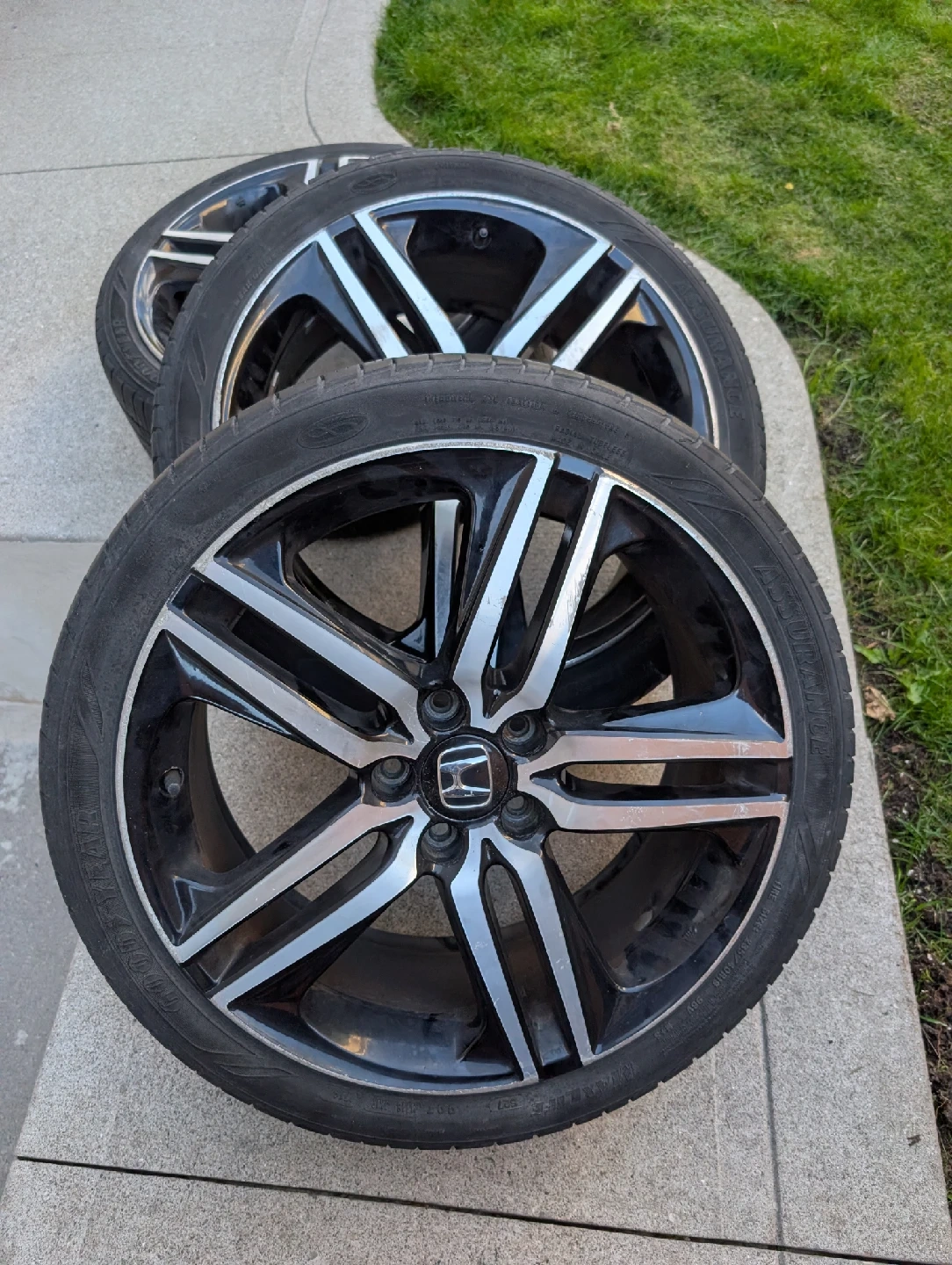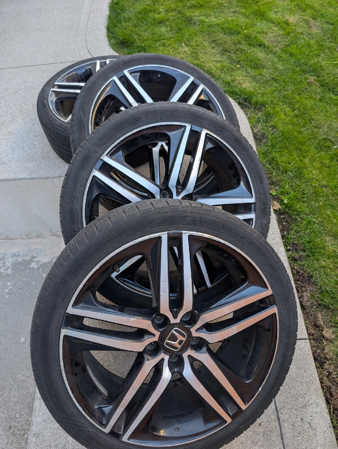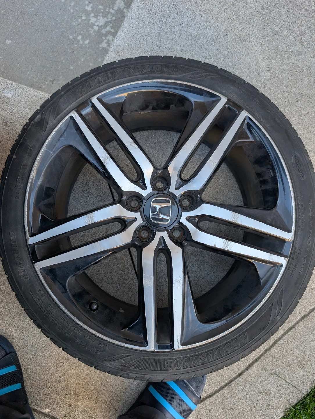 70Selling a set of Honda rims with tires. They're in good condition. the tires need a reseal and a leak fix on two them. and give away another tier with them. they are off from a 2019 Honda Accord sport (19in rims)