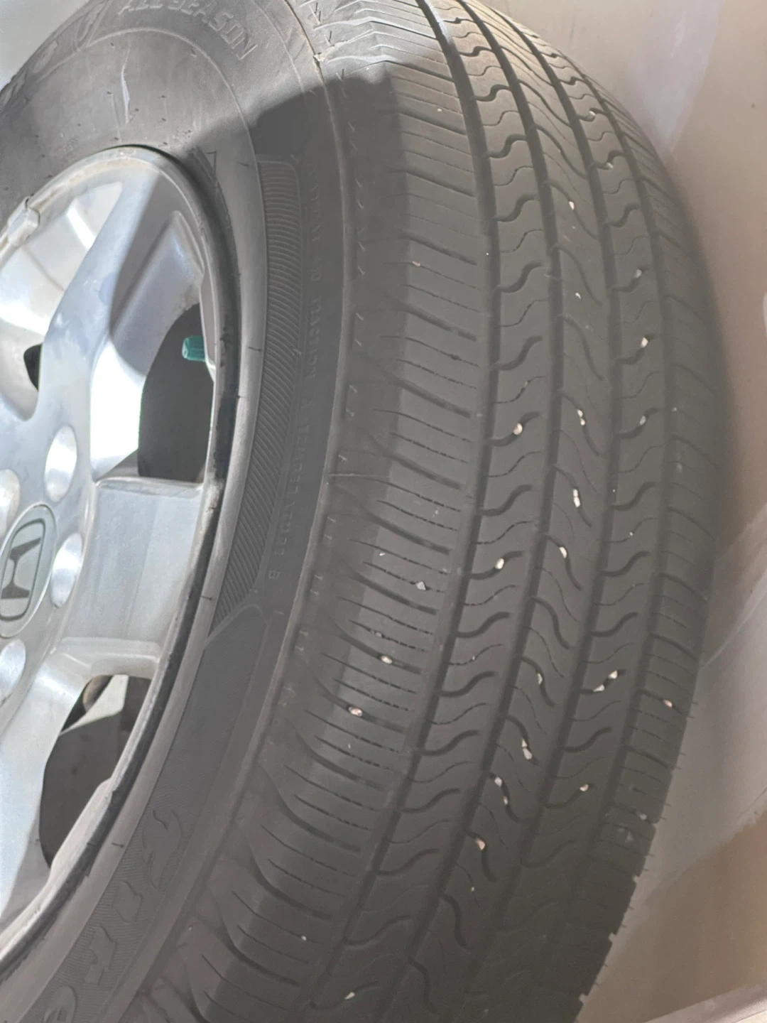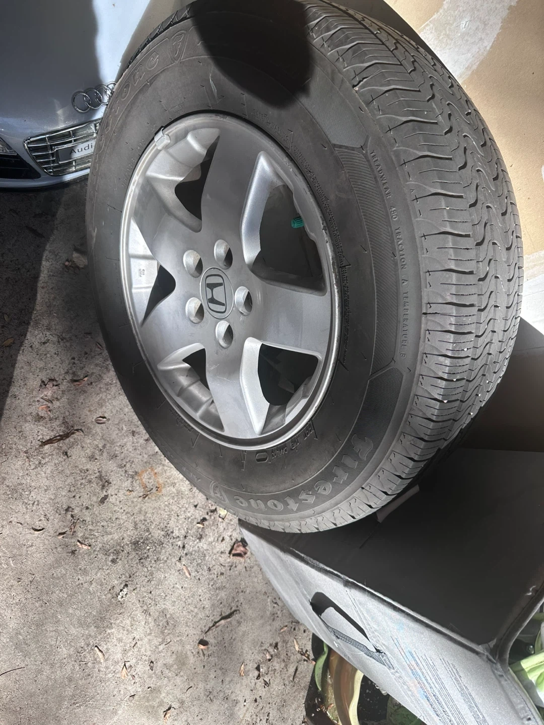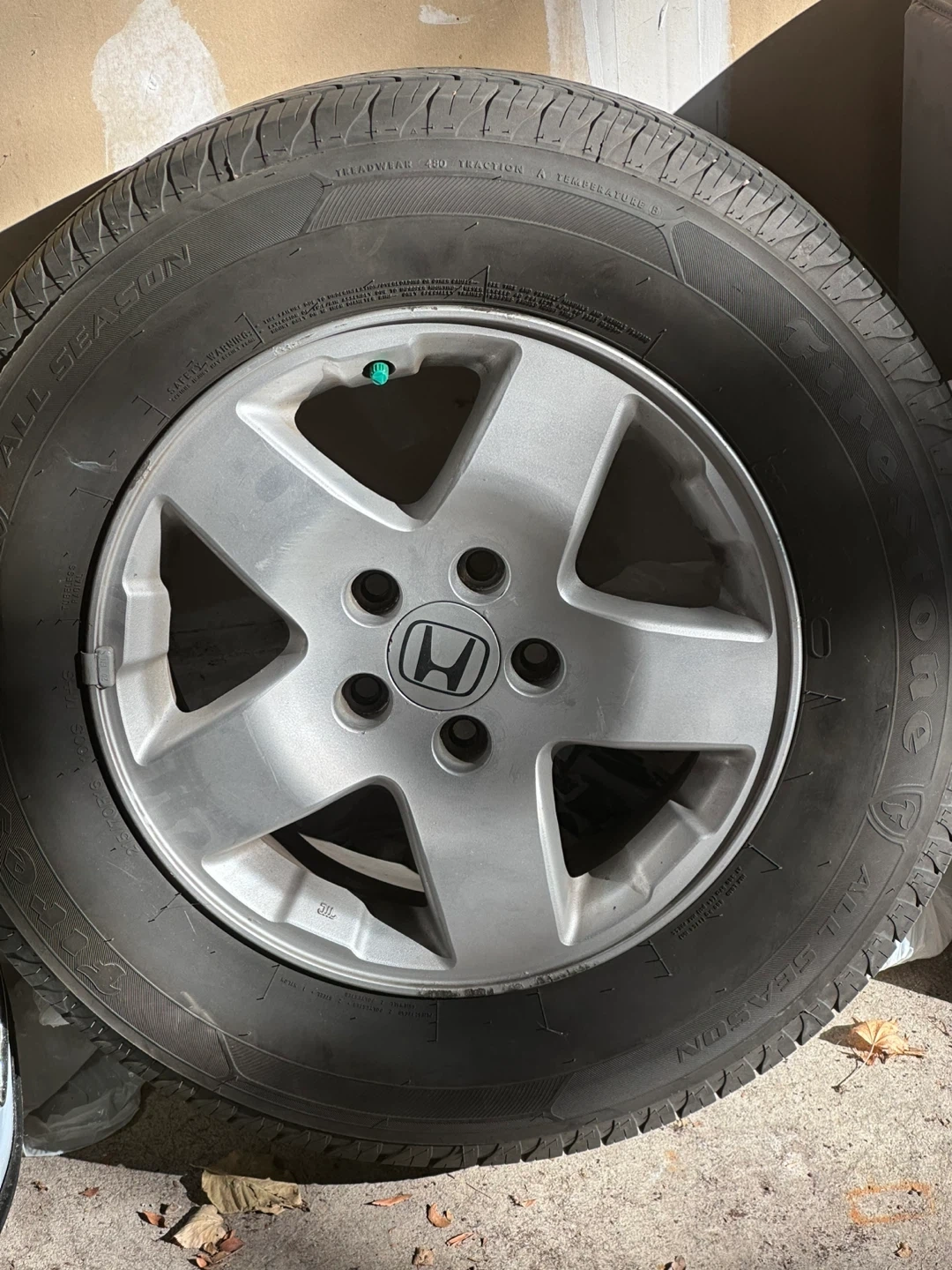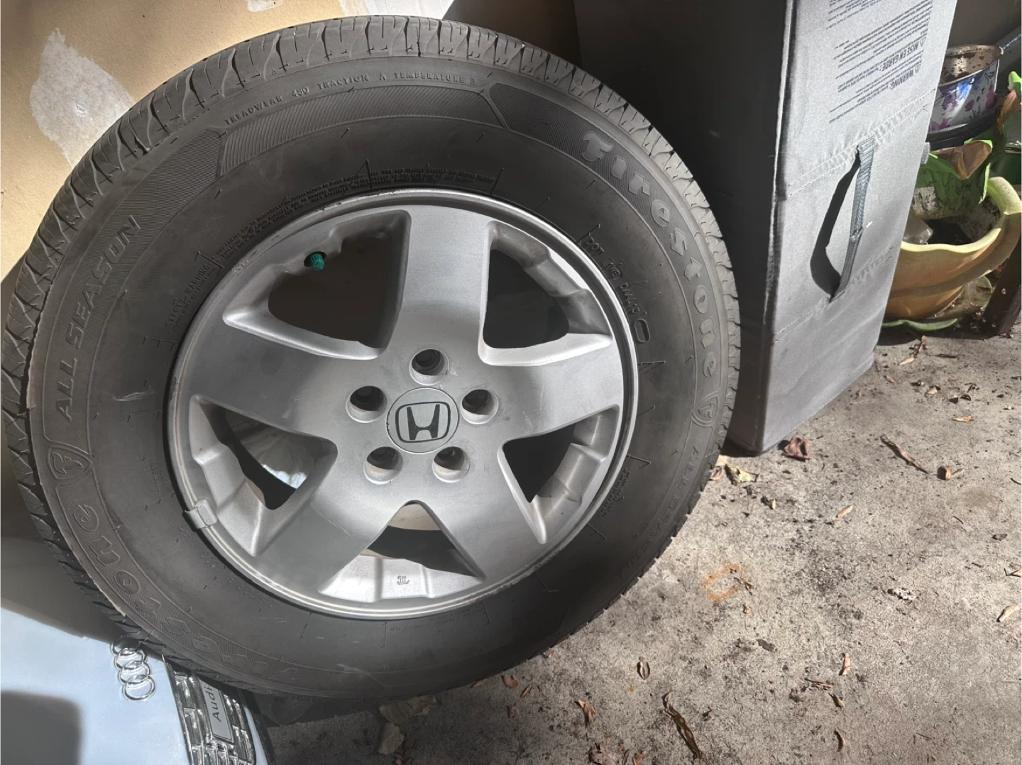 Selling a Honda wheel with a Firestone tire. The tire is an all-season type. It's in used condition.