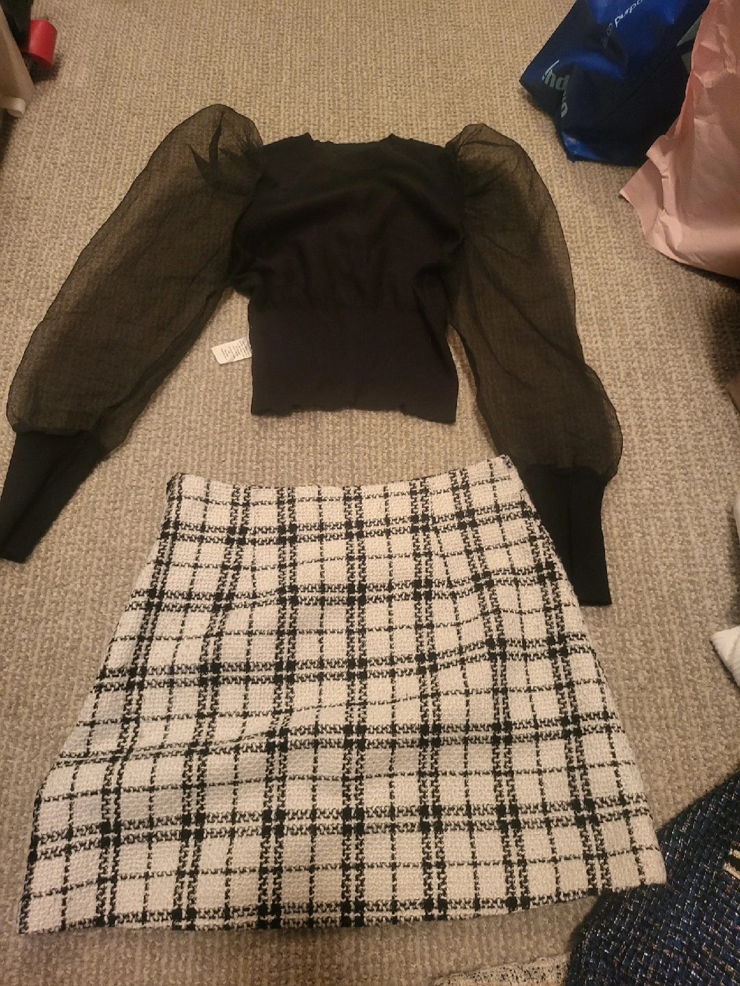Selling a cute black top with sheer puff sleeves and a matching plaid mini skirt. The skirt has a classic black and white pattern. Both pieces are in great condition and would make a stylish addition to your wardrobe