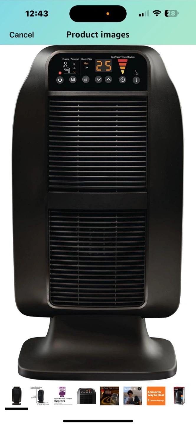 681500W ceramic heater. Six heat settings. Programmable timer. Quiet mode. Overheat protection. Excellent condition.