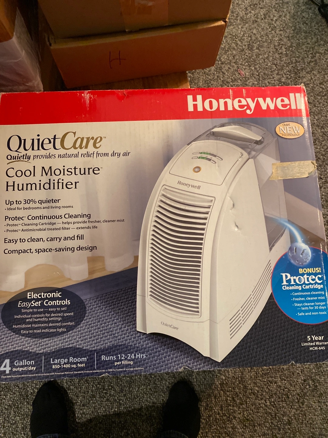 Selling a Honeywell QuietCare Cool Moisture Humidifier. It's designed to provide natural relief from dry air, and can be up to 30% quieter, making it ideal for bedrooms and living rooms. It features Protec Continuous Cleaning and is easy to carry and fill. Also included is a Honeywell Replacement Humidifier Filter, cleaning cartridges & mineral absorption pad. Moving Sale