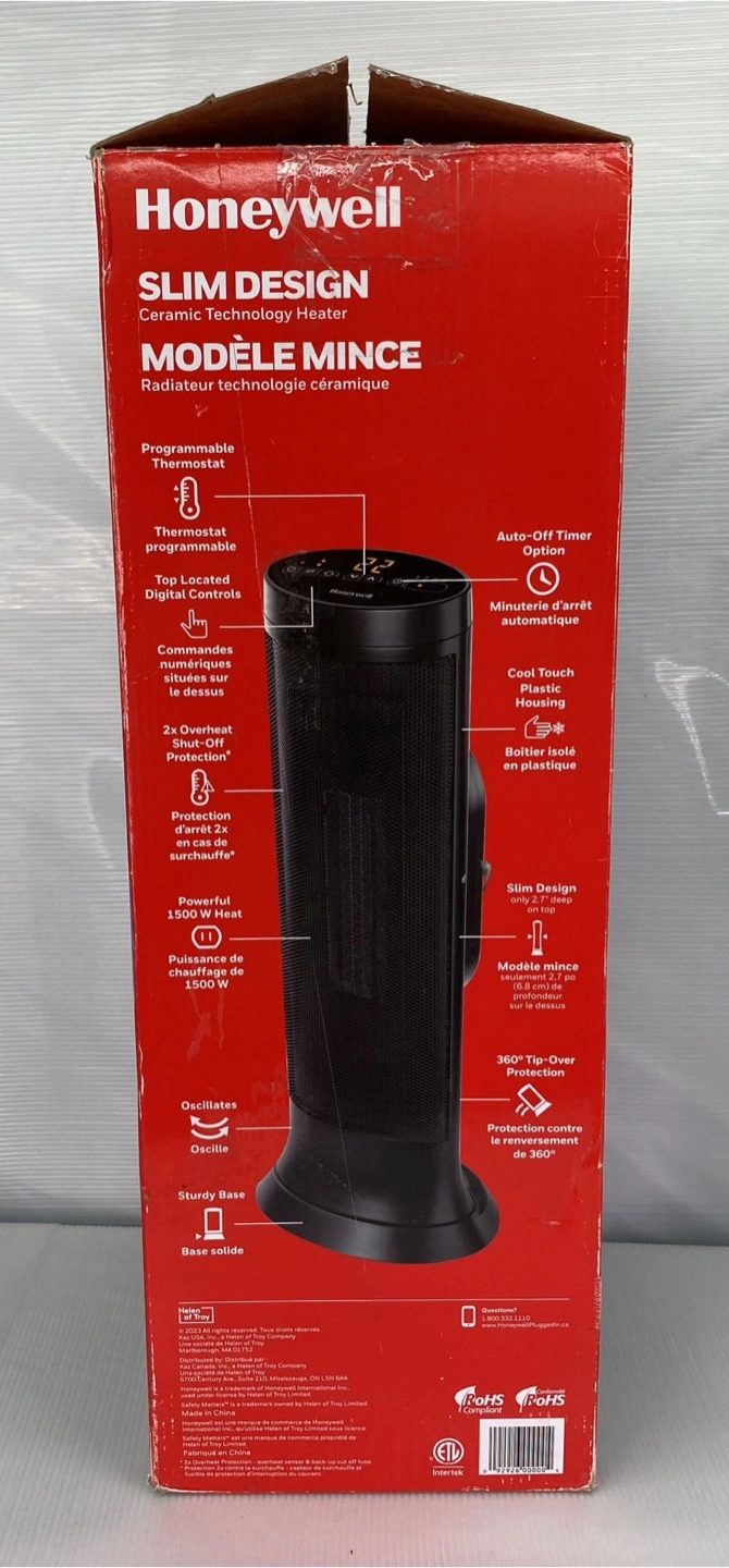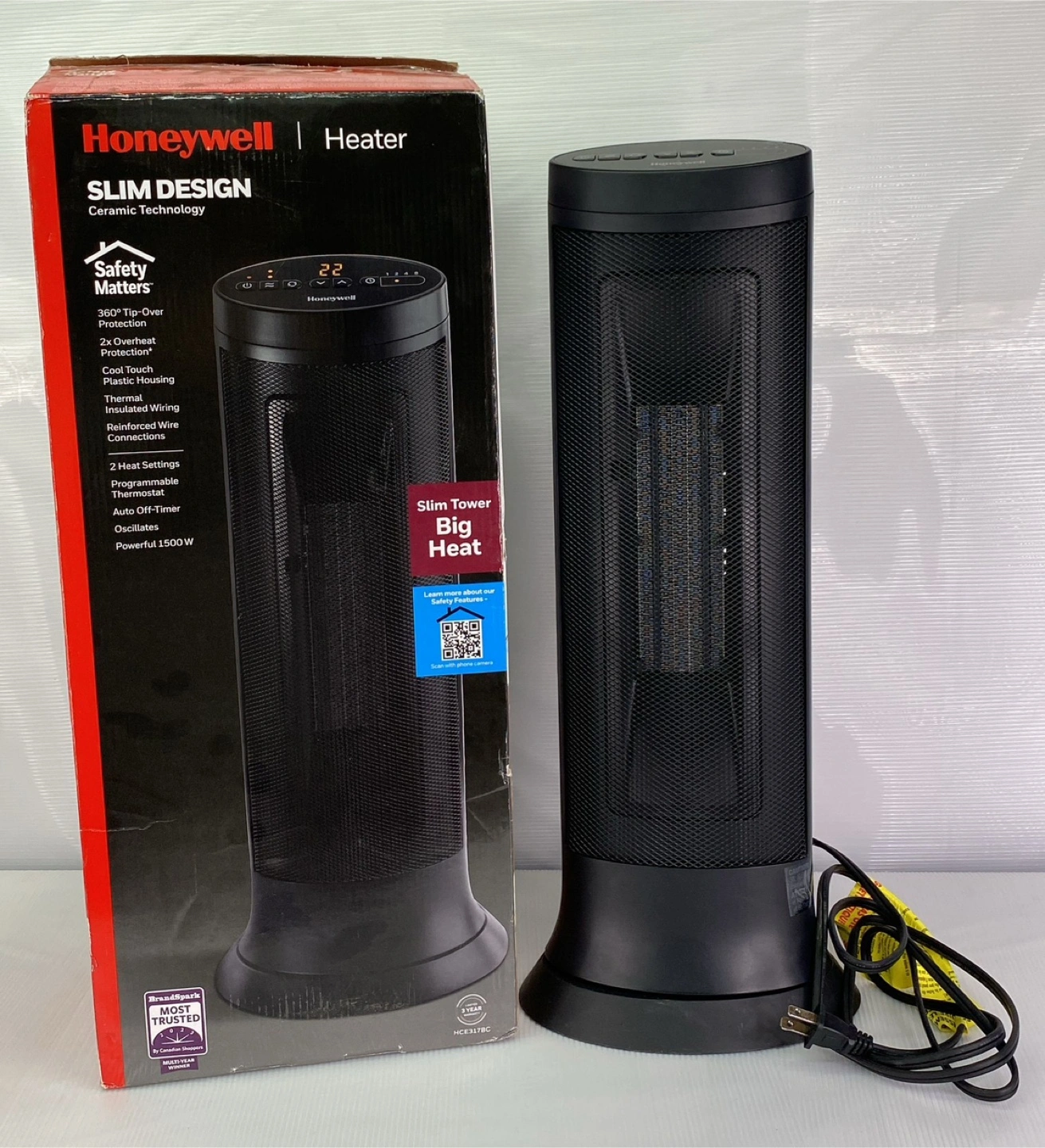 SKU:505 Powerful 1500W ceramic heater. Slim tower design. Programmable thermostat. Oscillates. Auto-off timer. Cool-touch housing. Multiple heat settings. Overheat protection.