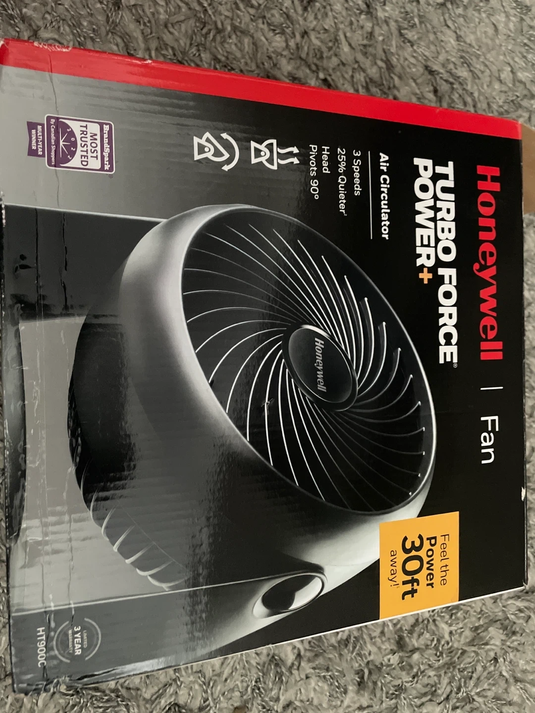 Used for a season. Selling a Honeywell Turbo Force Power+ fan! It's an air circulator with 3 speeds and a head that pivots 90°. It's also 25% quieter, so it won't disturb you while you're relaxing. Feel the power 30ft away!